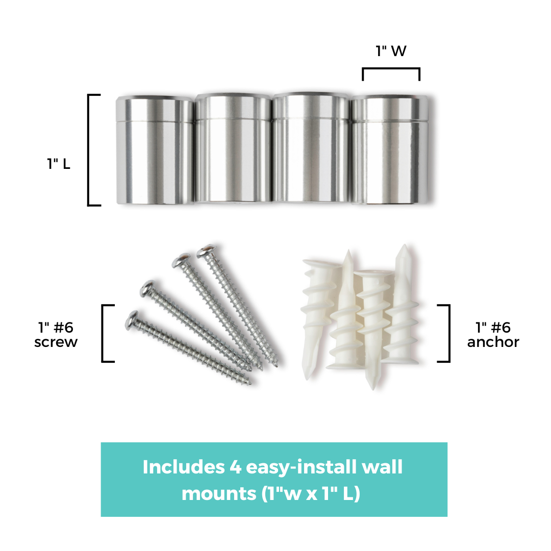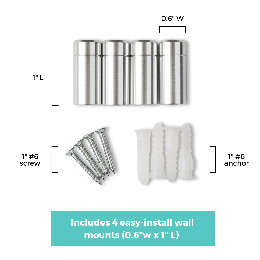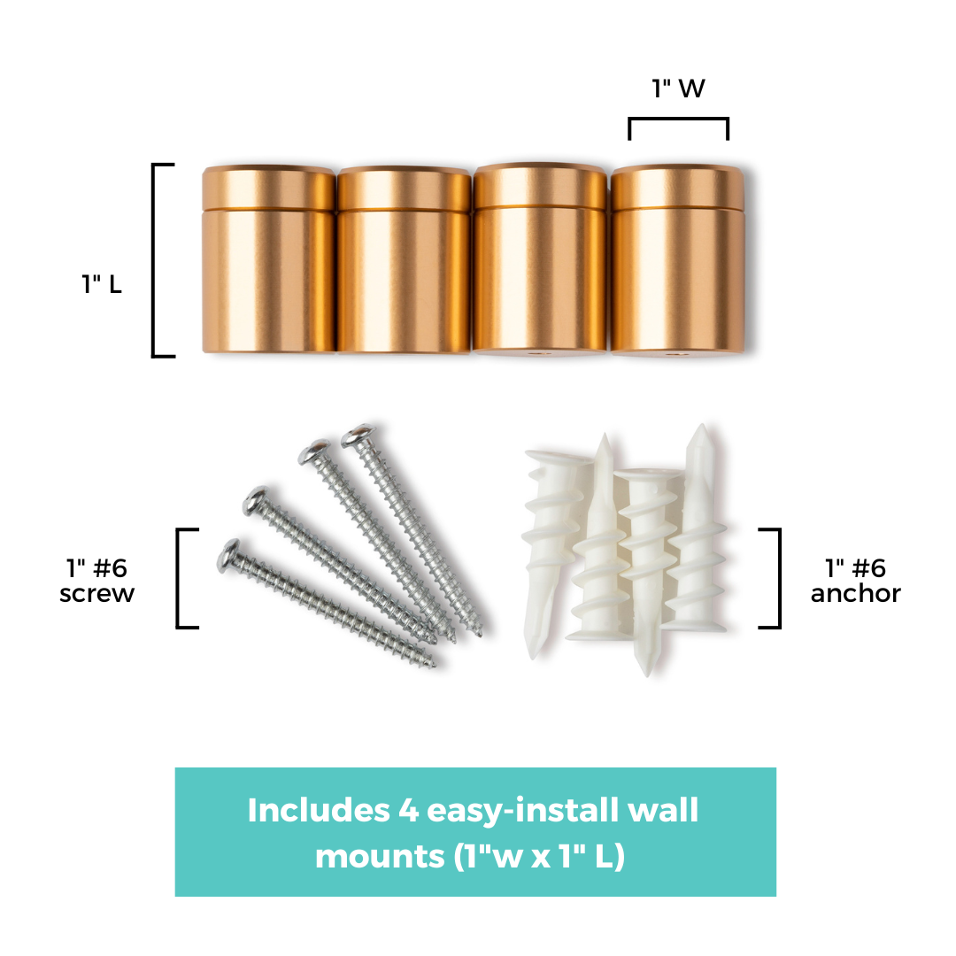 - 4 easy-install wall mounts with screws and anchors (0.6"w x 1.5" L) (Silver or Gold)