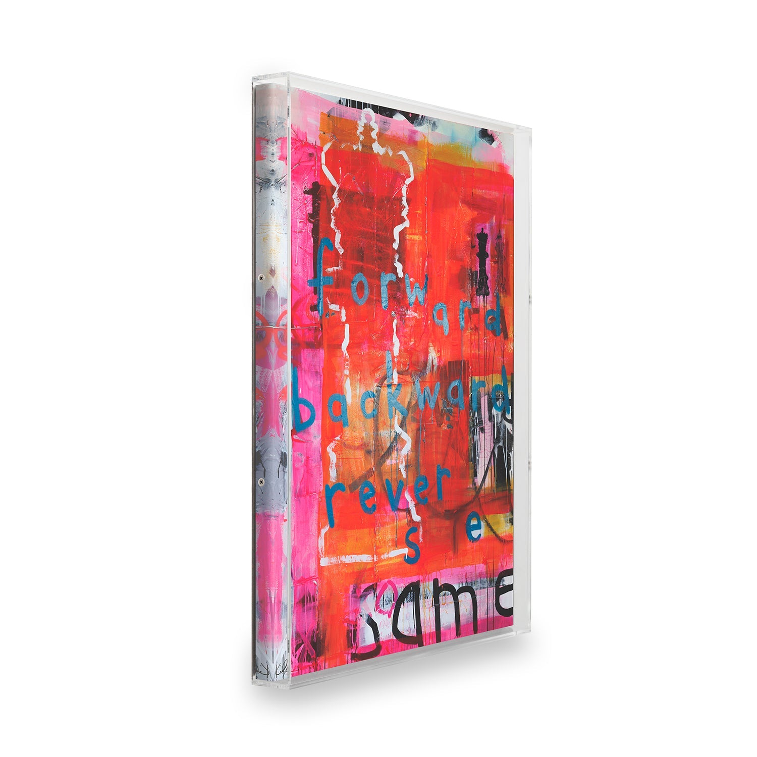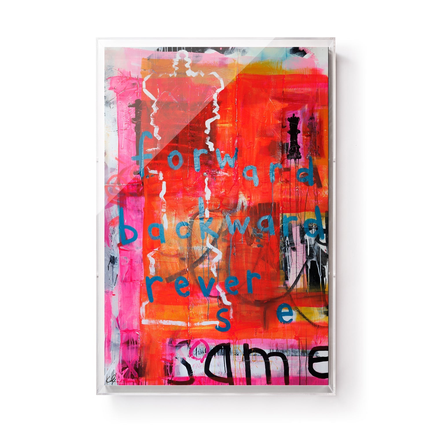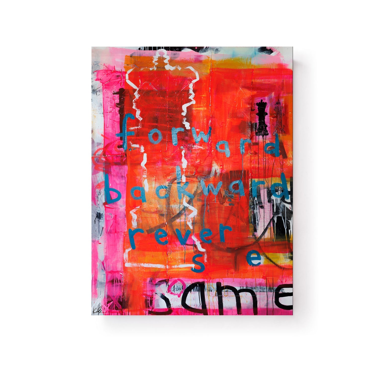 Kent Youngstrom's Forward Backward is packed with translucent and saturated reds, oranges, and pinks that create a well-balanced composition. The lettering and positive message of the piece fill up the space of the canvas and the hearts of the viewers. This art piece is also accompanied by a poem: