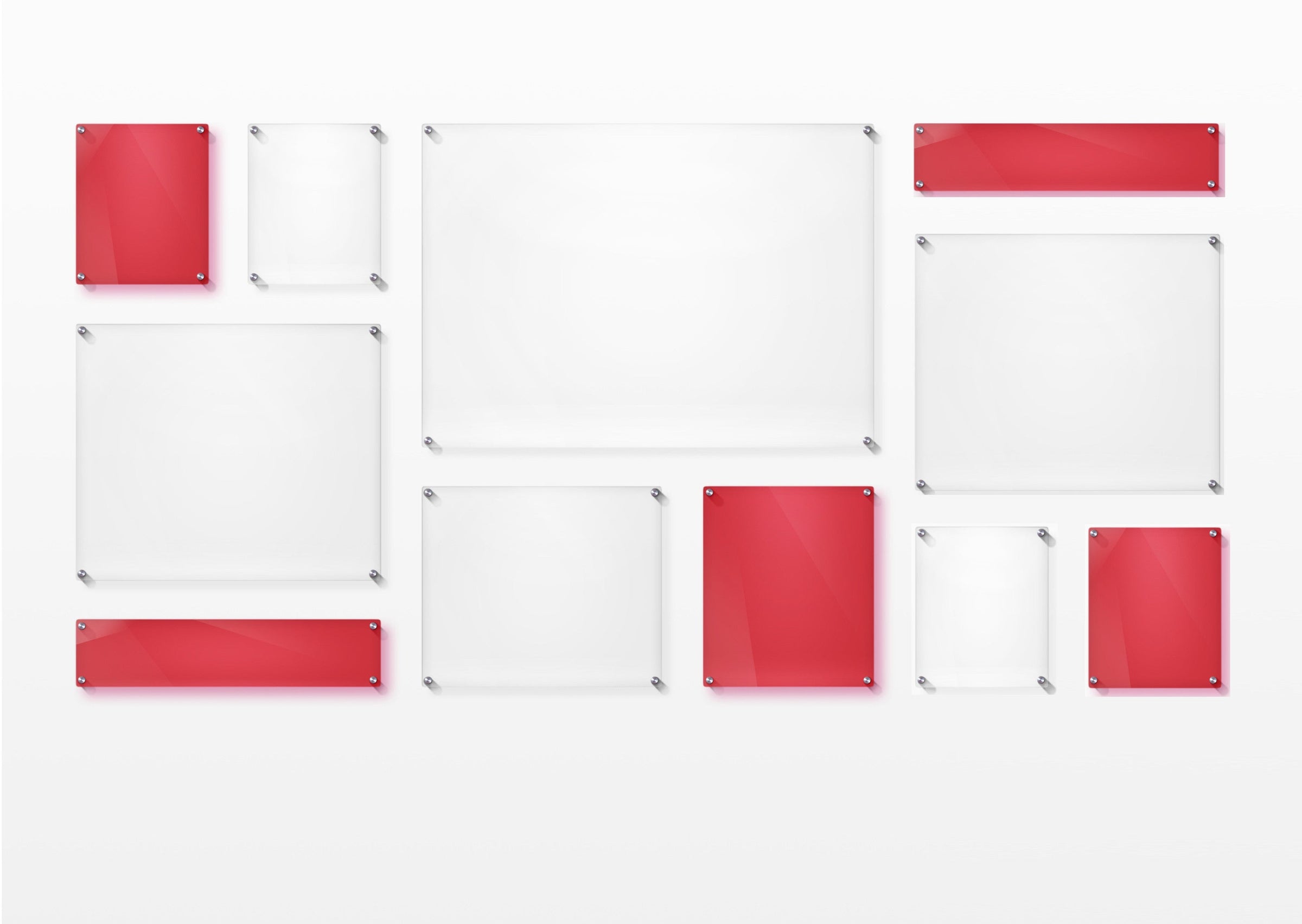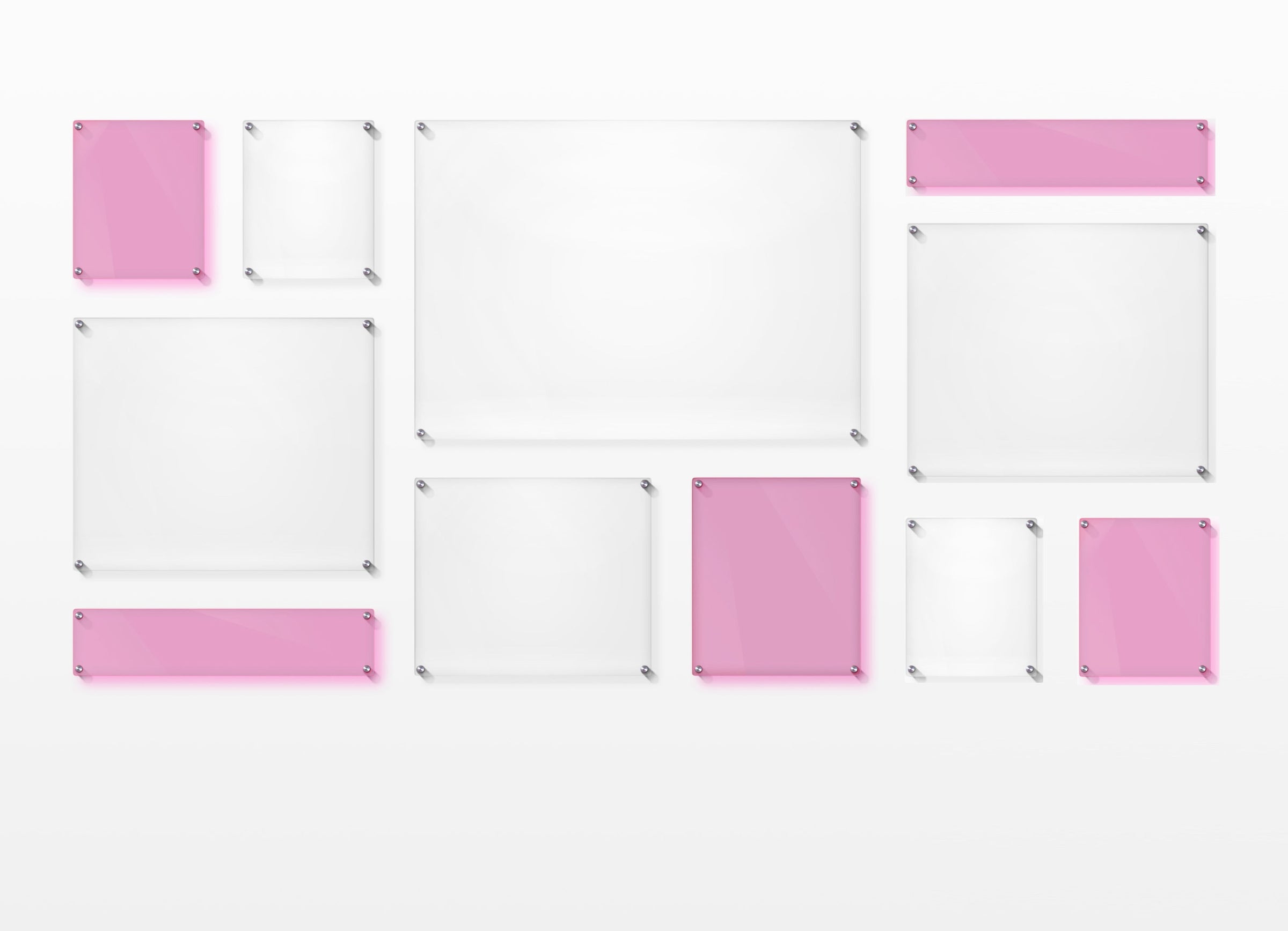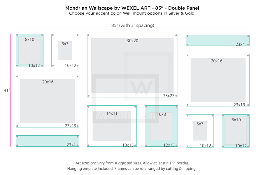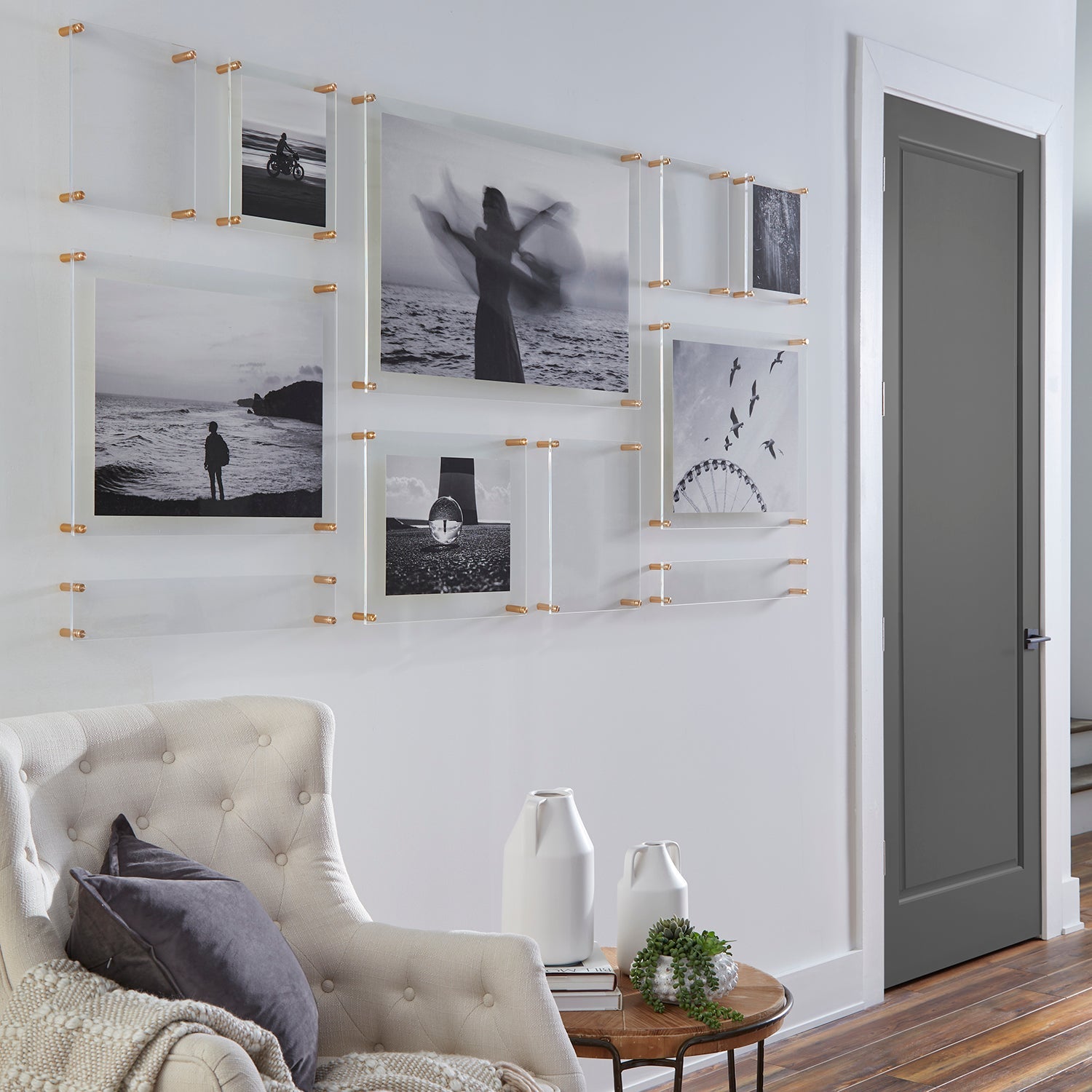 • Choose your 3-frame accent color or go with all clear frames. 1/8" Glossy or Frosted Accent Color Panels available. Sample chips available.• Choice of Silver or Gold wall mounts. Includes screws and anchors.