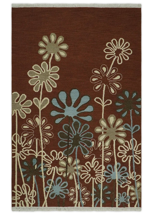 5x8 Brown, Camel and Silver Floral Pattern Flatwoven Soumak Weaver Farmhouse Wool Area Rug