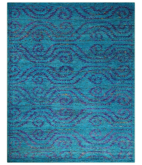 8x10 and 9x12 Hand Knotted Teal Blue and Violet Modern Contemporary Southwestern Tribal Trellis Recycled Silk Area Rug | OP10