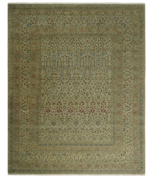 8.6x10 Hand Knotted Ivory and Green Floral Traditional Antique Style Wool Area Rug