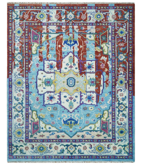 8x10 Wool Blue and Red Abstract Vibrant Colorful Hand knotted Heriz Serapi Area Rug | TRDCP306810