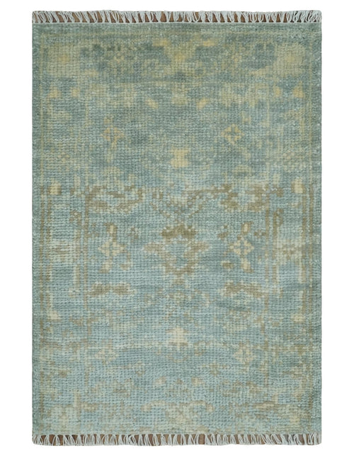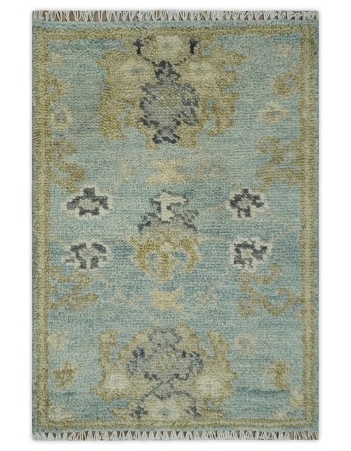 2x3 Iight Green and Ivory Hand Knotted Oriental Oushak Wool Area Rug, Kids, Living Room and Bedroom Rug