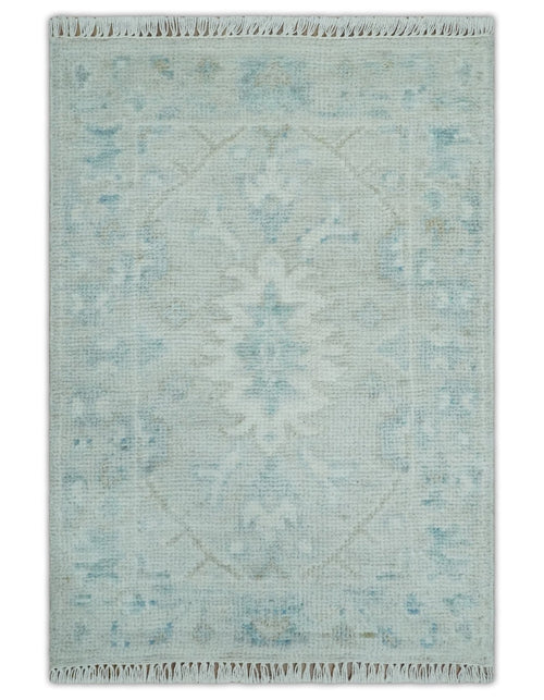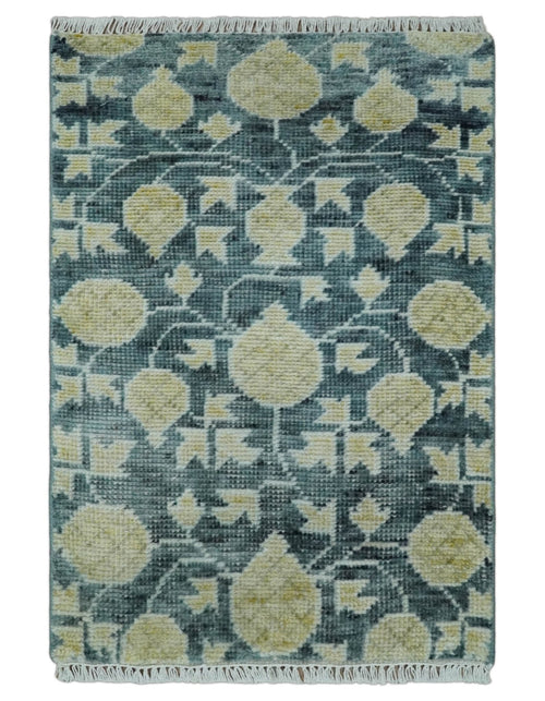 2x3 Hand Knotted Teal and Beige Balloon shape Oushak Wool Area Rug