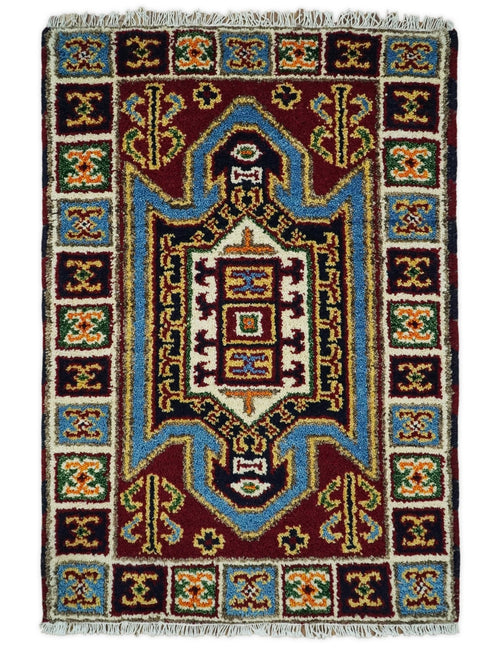 2x3 Hand Knotted traditional Kazak Rust and Blue Doormat Rug | KZA25