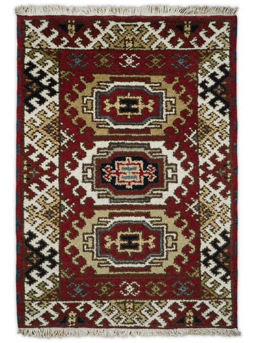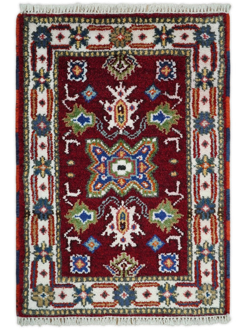 2x3 Red and Ivory Wool Hand Knotted traditional Persian Vintage Antique Southwestern Kazak | TRDCP28623