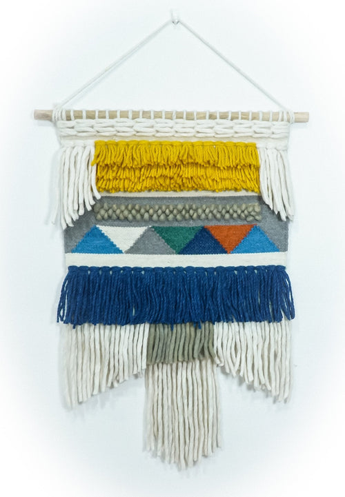2x3 Wool Hand Woven Blue, White and Gold Boho Wall Hanging | WH2