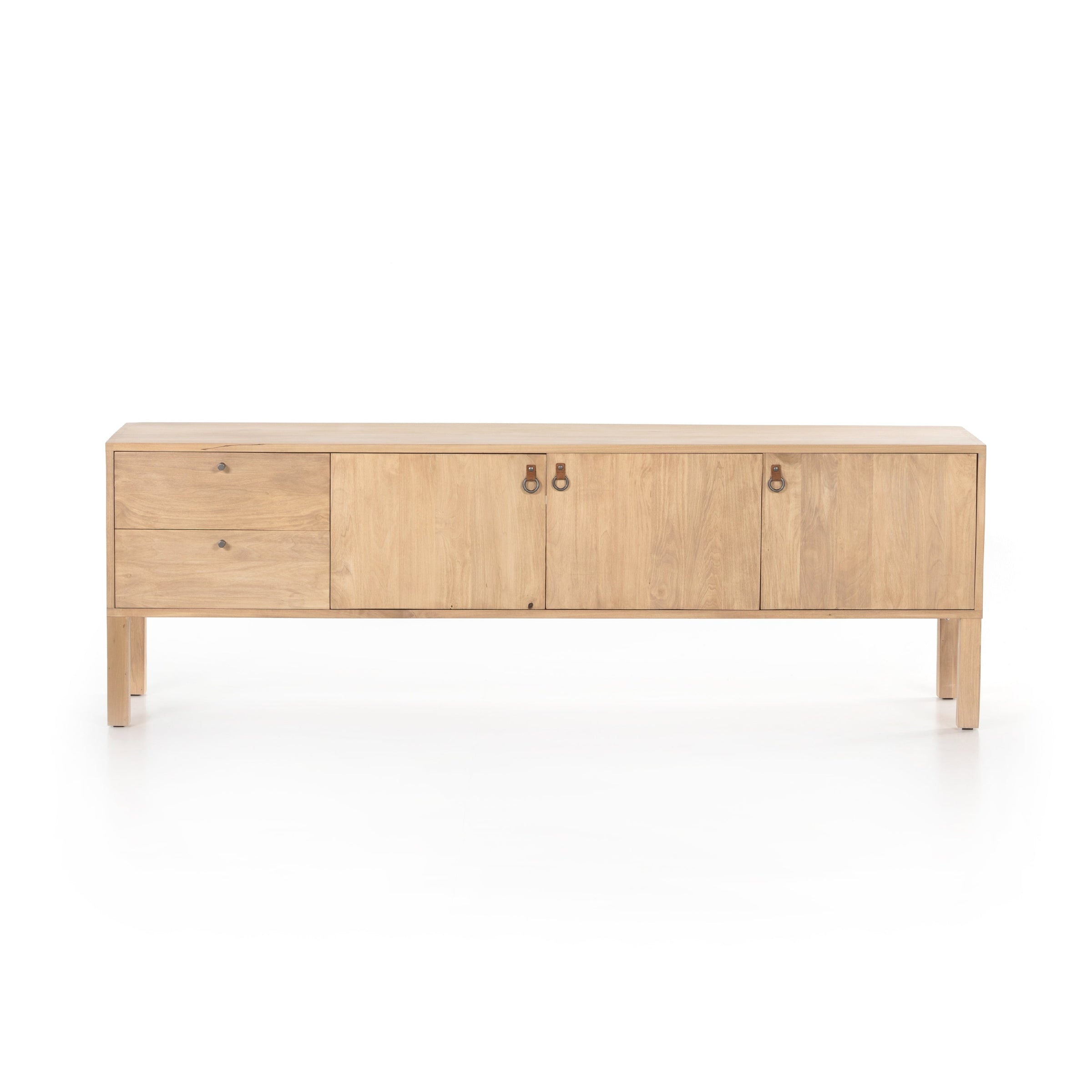 This Isador Media Console - Dry Wash Poplar is clean, bright and dreamy. Solid dry-washed poplar forms a clean-lined media console with dovetail joinery plus iron and leather hardware, for a fresh look to any living room.