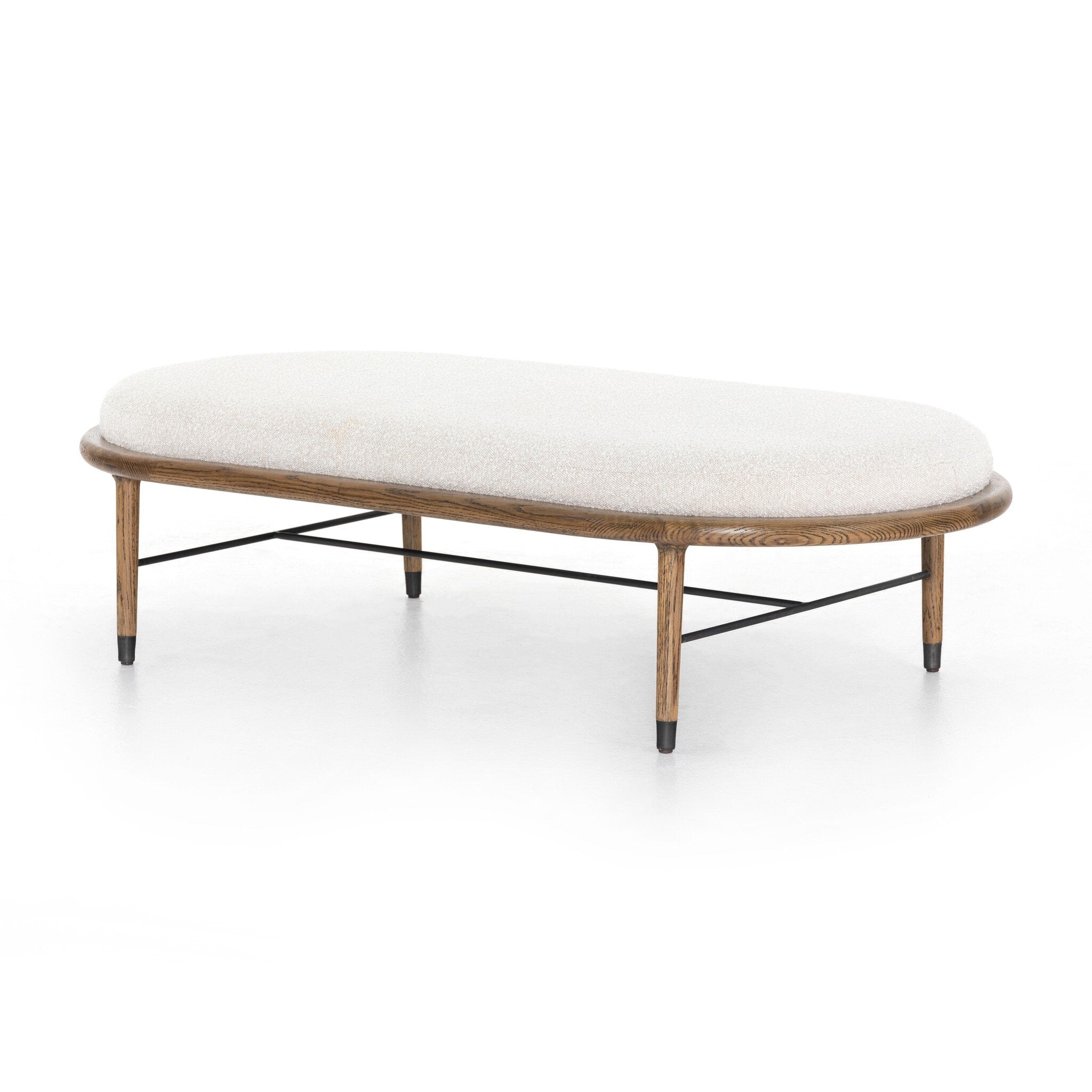 Vintage gone modern. Solid oak forms a finely sculpted oval for textural boucle upholstery in a beautifully rich cream. Gunmetal-finished iron stretcher and ferrule caps for a fresh finishing touch. Performance fabrics are specially created to withstand spills, stains, high traffic and wear, ensuring long-term comfort and unmatched durability.