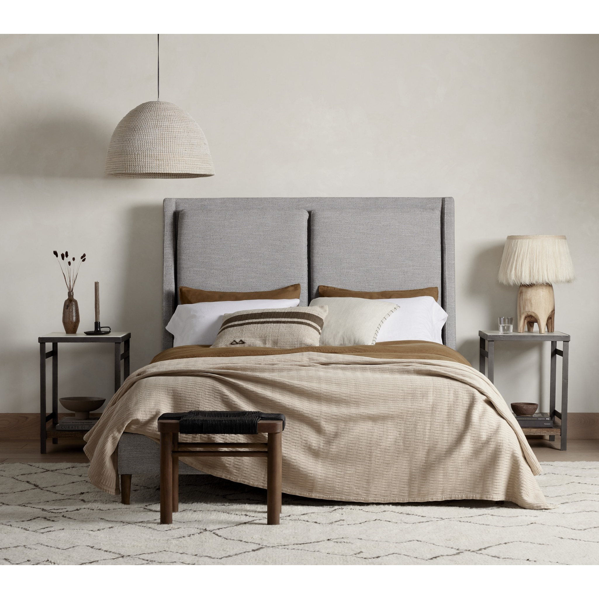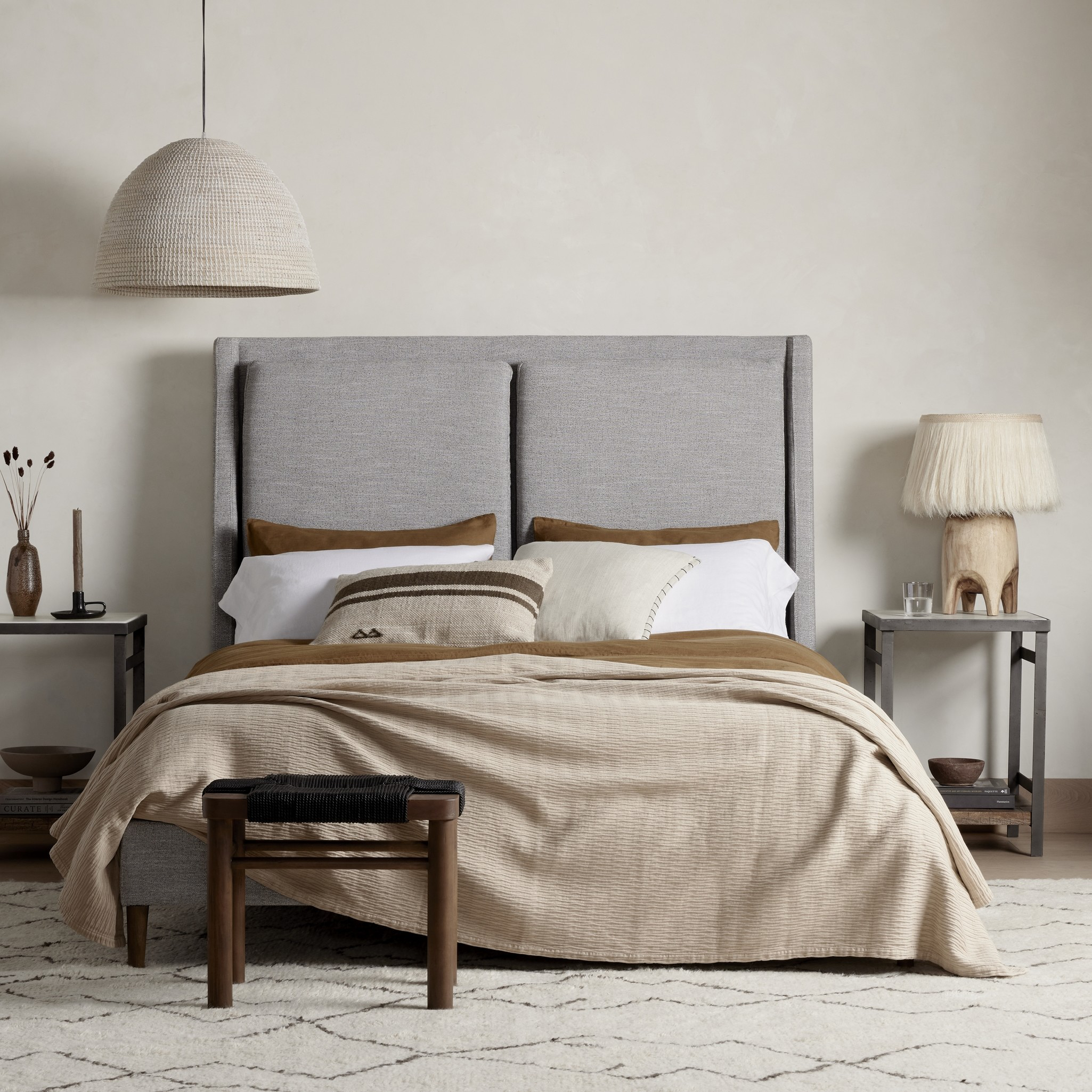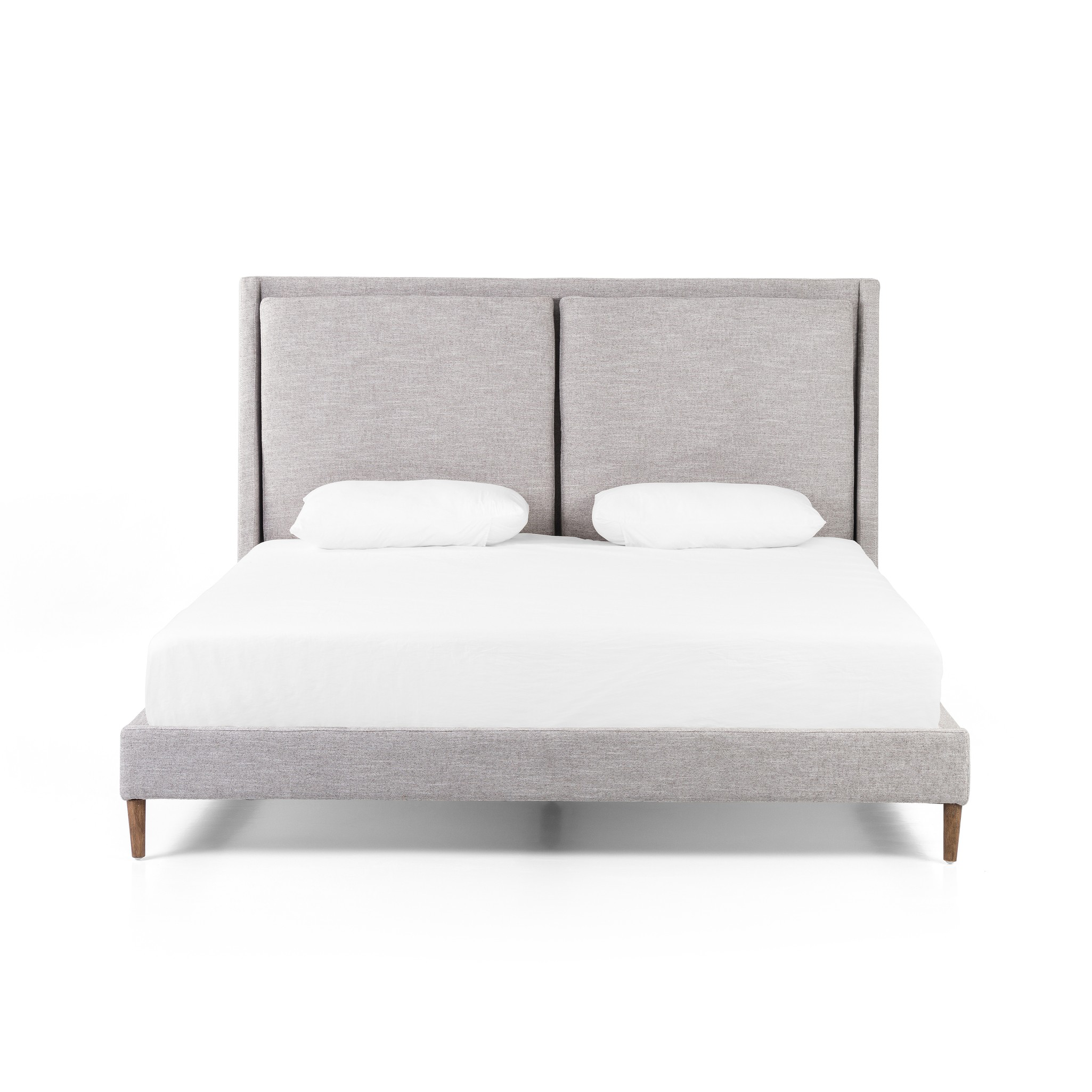 Light, livable luxury. Upholstered in a grey synthetic-blend, a tapered headboard features fixed overscale pillows, for a calming look with great depth. Wire-brushed parawood legs lend a warm, natural finishing touch. Performance fabrics are specially created to withstand spills, stains, high traffic and wear, ensuring long-term comfort and unmatched durability.