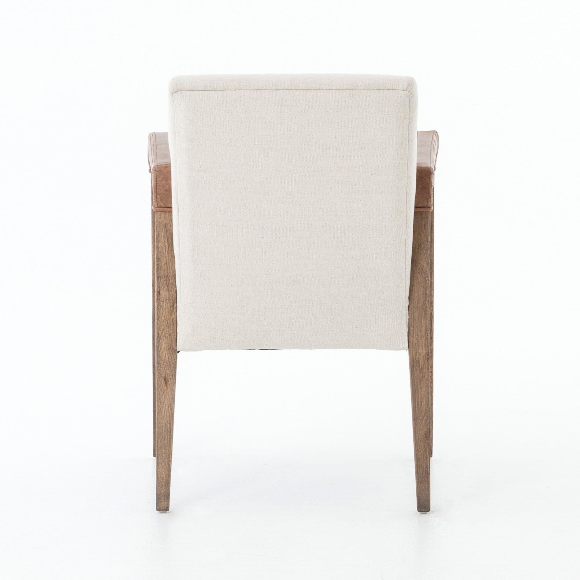 Elegance is no exaggeration with this Reuben Dining Chair - Harbor Natural. Slim, tapered oak with arms wrapped in vintage leather frames a floating seat covered in natural linen. We'd love to see this in your dining room, kitchen, or other space!