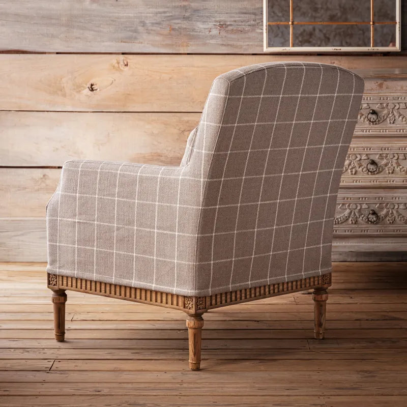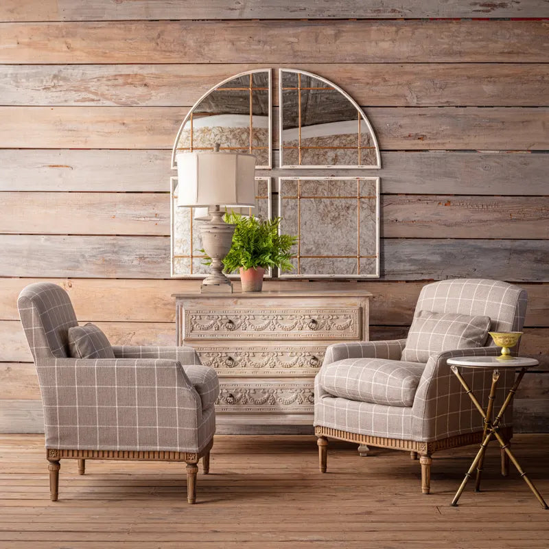 The Window Pane Arm Chair combines comfort with distinctive style, featuring warm tan upholstery accented by crisp white window pane detailing. Its relaxed proportions and neutral palette make it a versatile addition to living rooms, bedrooms, or accent spaces. Perfect for creating visual interest while maintaining a cohesive, inviting aesthetic throughout your home.