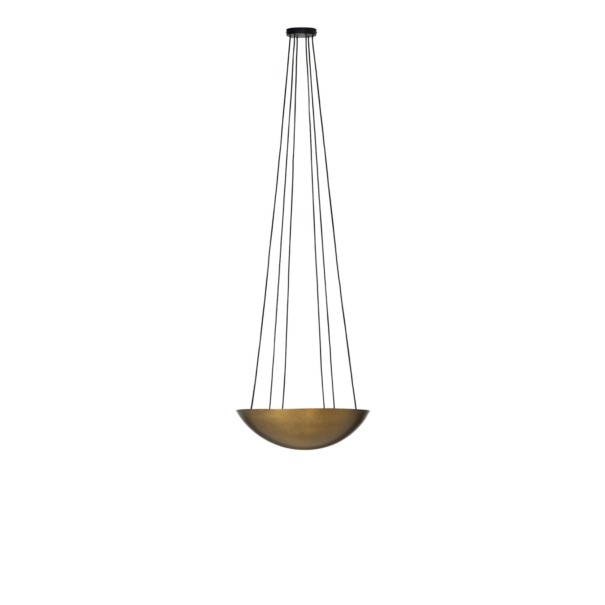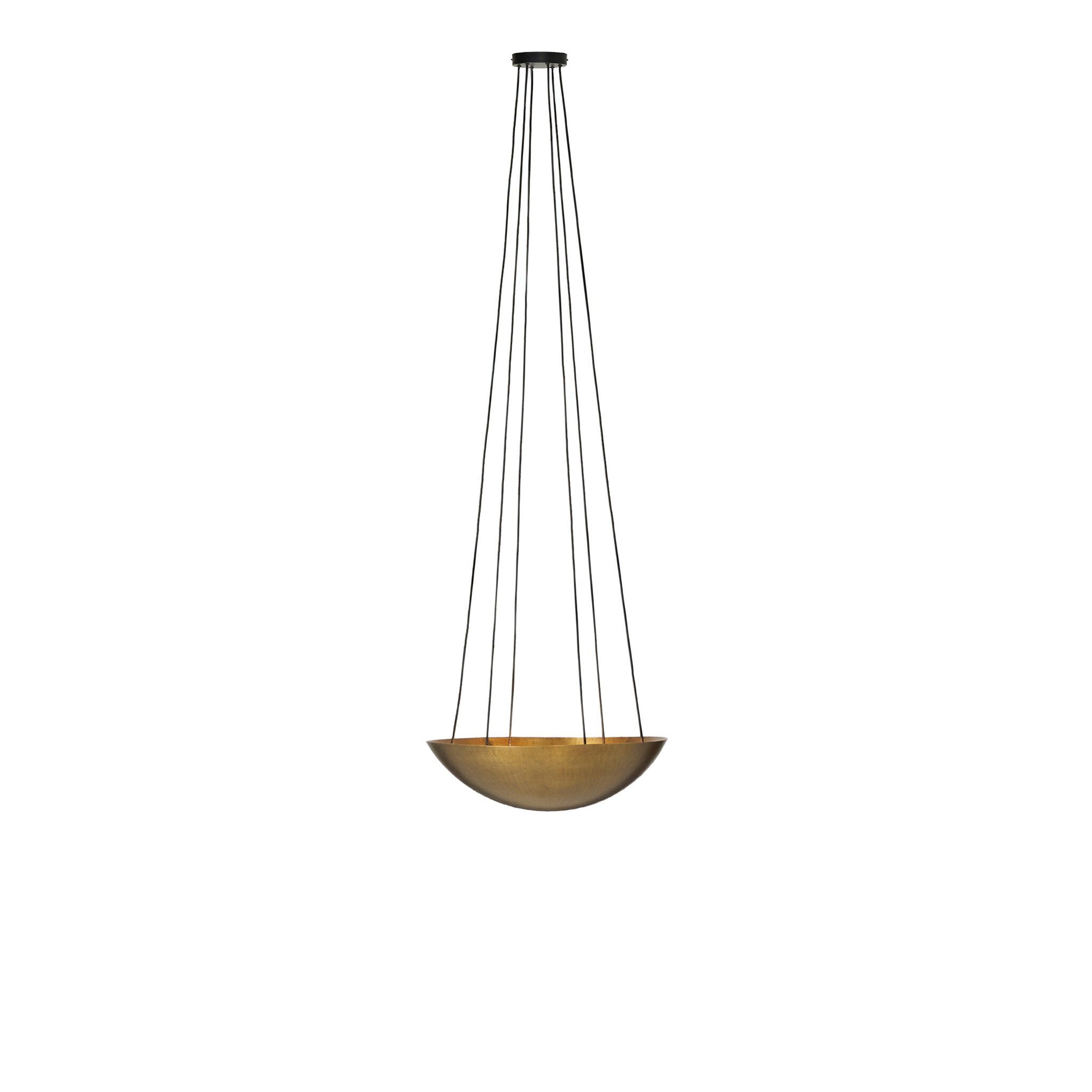 A wide, shallow bowl in aged brass with six sockets, diffusing light upward for an ambient glow. Suspended by six sleek cords, its streamlined design eschews traditional tension wires for a clean silhouette.