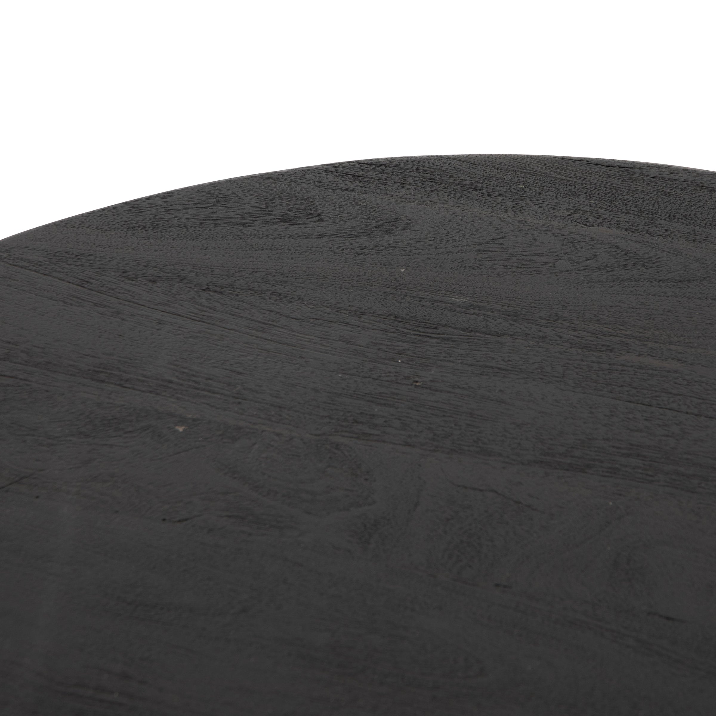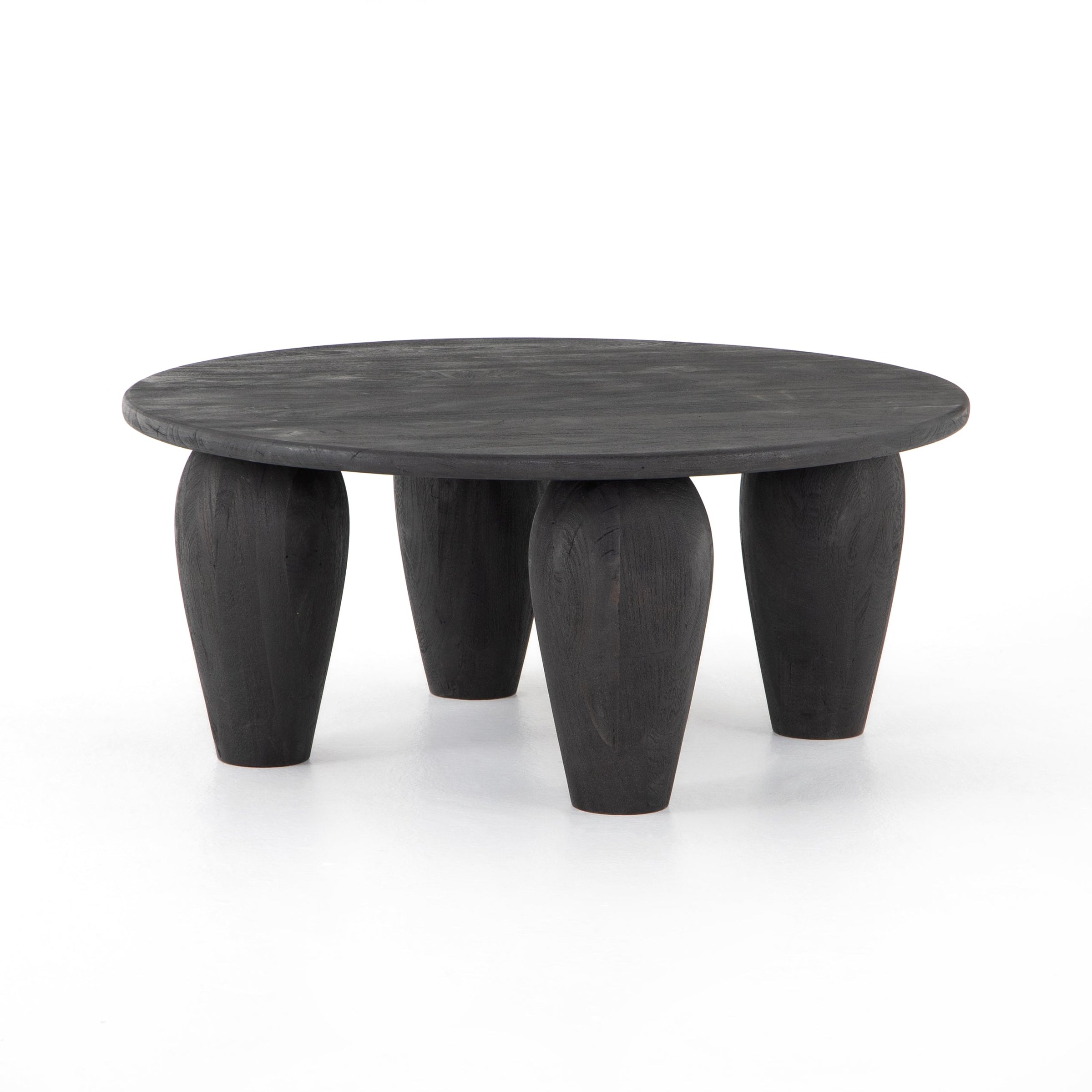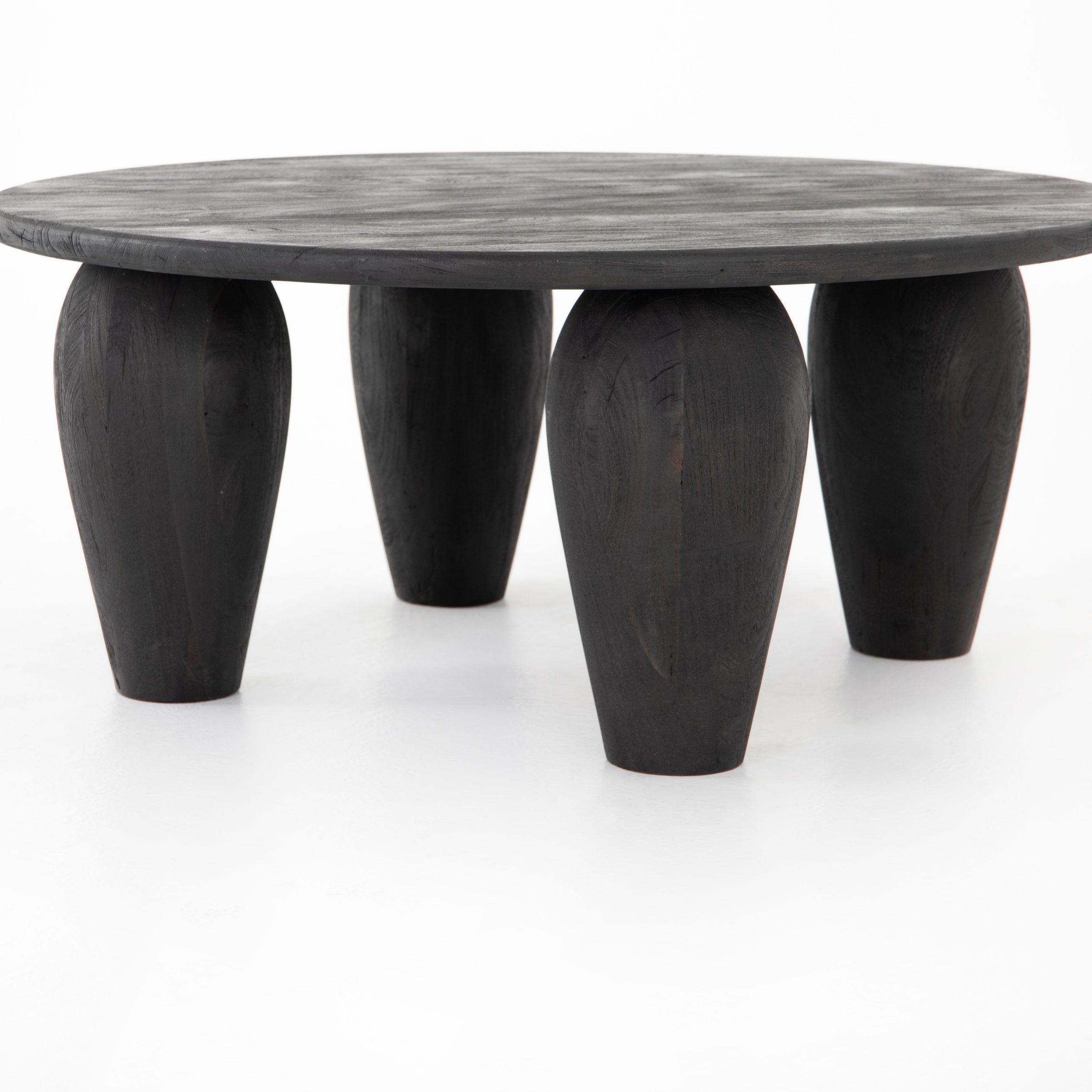 We love the shapely, substantial legs that support a slim, rounded tabletop of light black-finished reclaimed woods in this Maricopa Coffee Table - Dark Totem. A global, organic look with a handcrafted vibe.