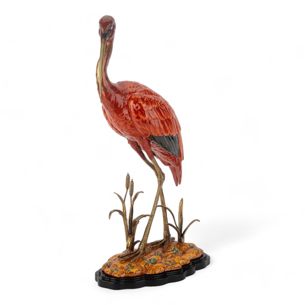 - Bring nature's vibrant beauty into your home with this striking porcelain bird figure. Handcrafted with meticulous detail, the scarlet ibis showcases rich crimson plumage complemented by elegant bronze ormolu accents that add a touch of refined sophistication. Standing at an impressive 27.5 inches tall with a 18-inch length and 9-inch width, this statement piece commands attention on any shelf, mantel, or display cabinet. Perfect for collectors and design enthusiasts who appreciate fine artisanal craftsmanship and ornithological artistry.