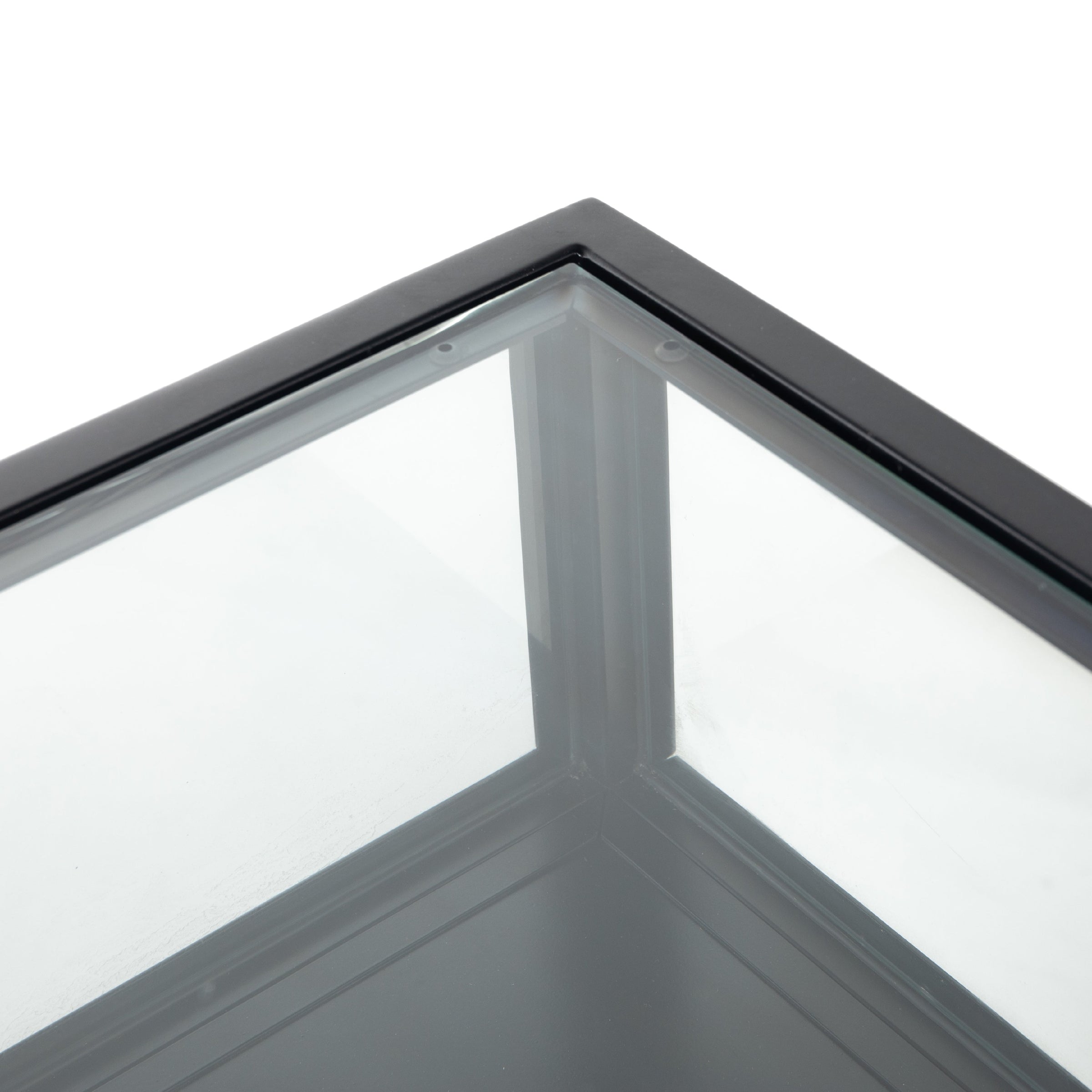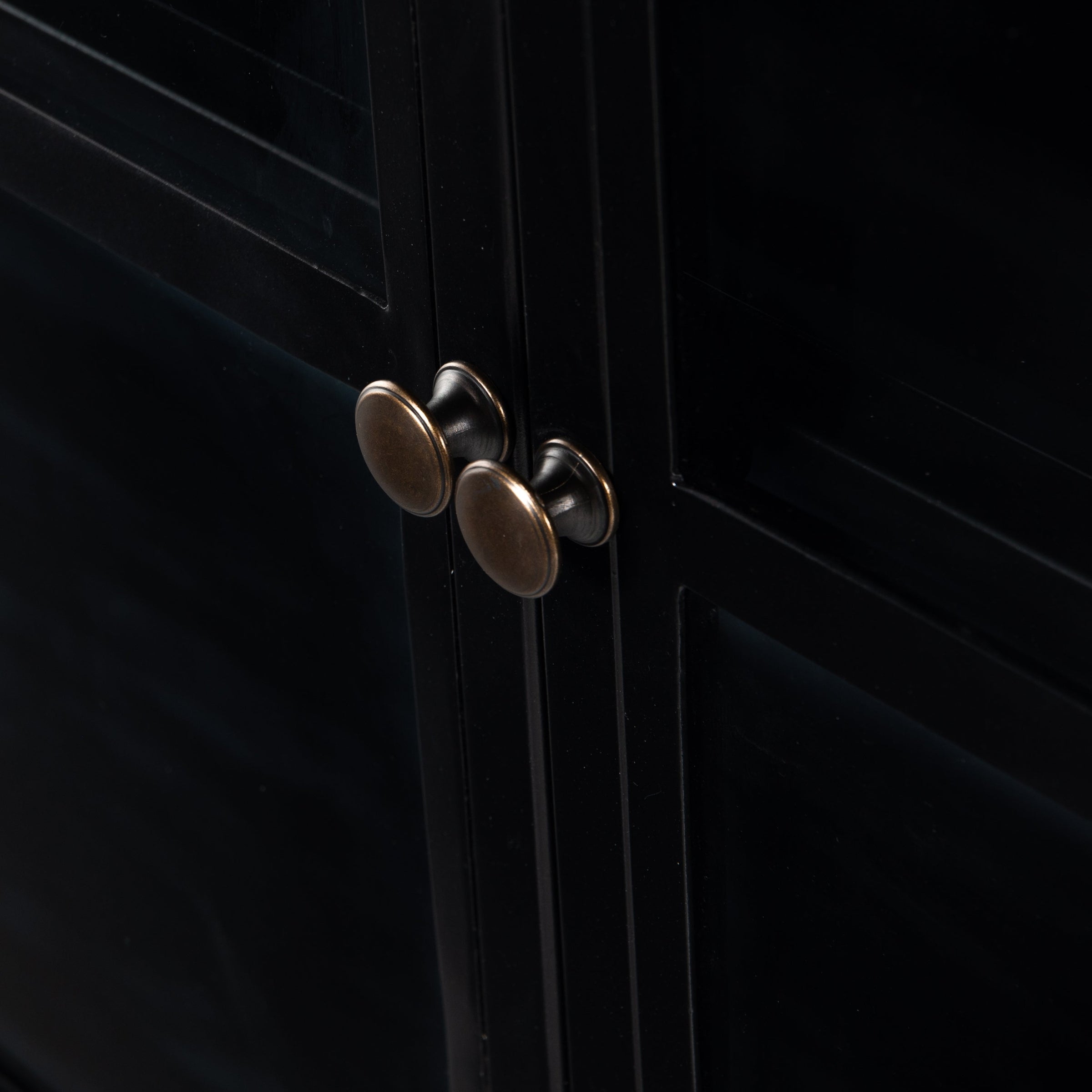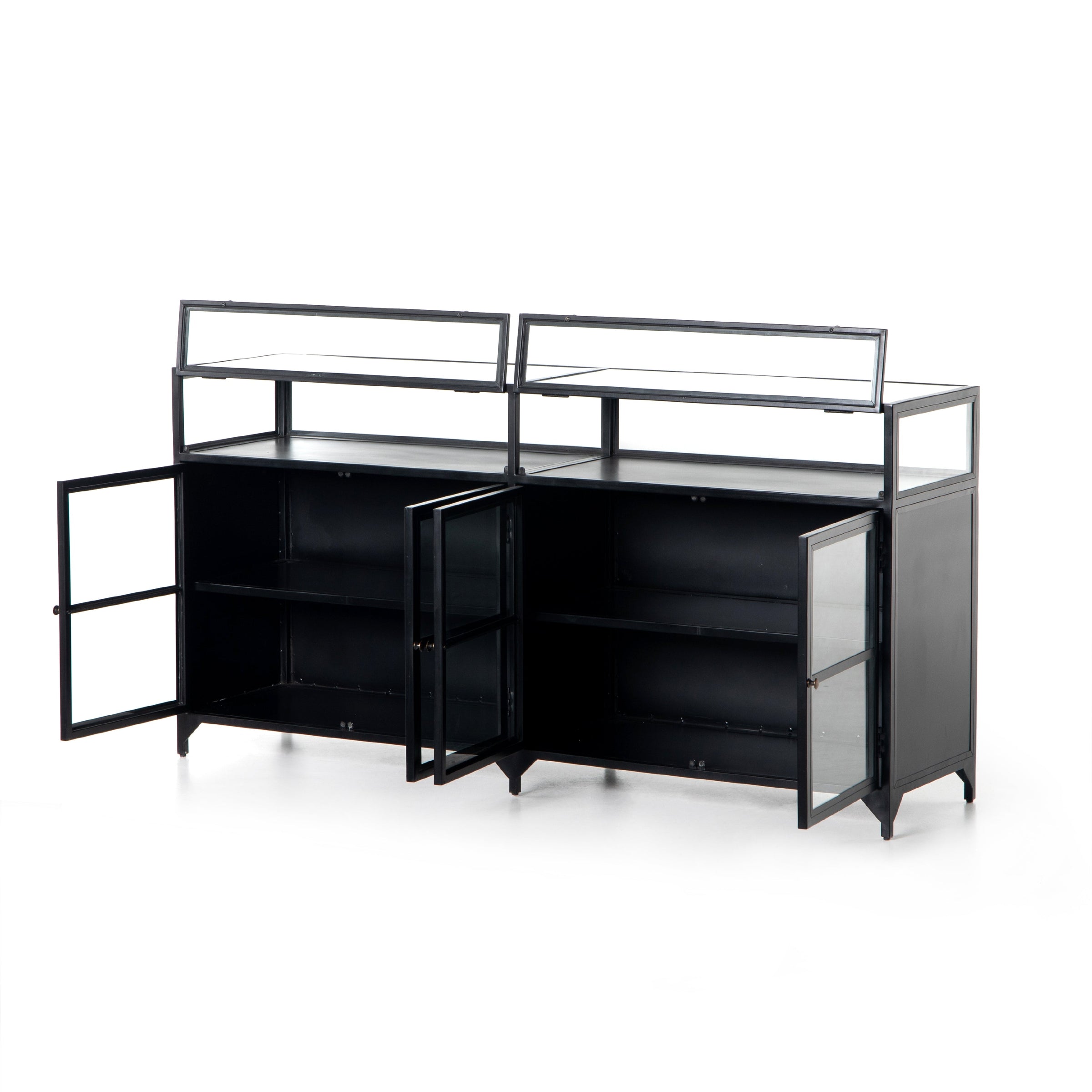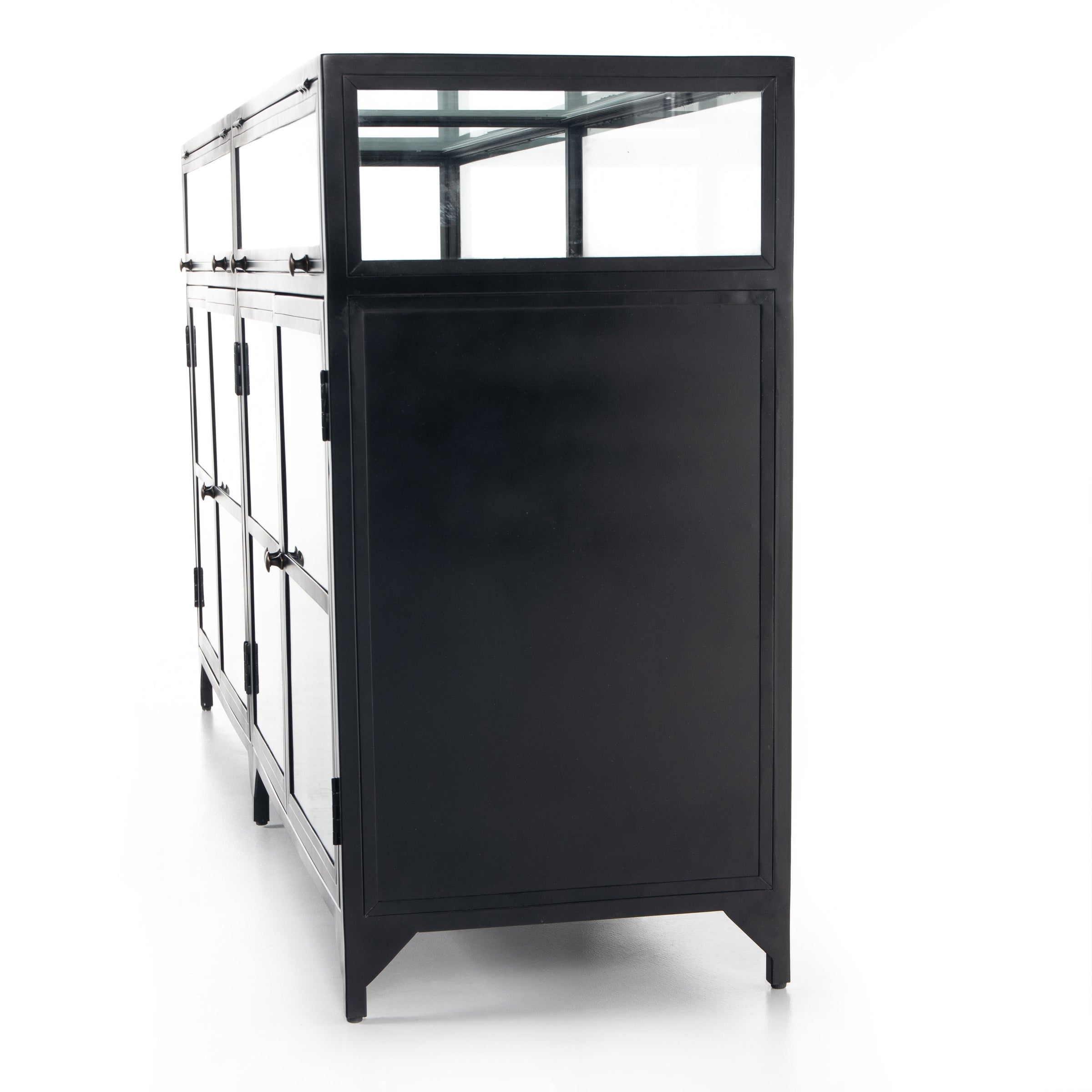 This Shadow Box Sideboard gives your inner collector a place to play. Store prized possessions behind clear glass fronts, with black-finished metal casing and brass hardware for contrast.