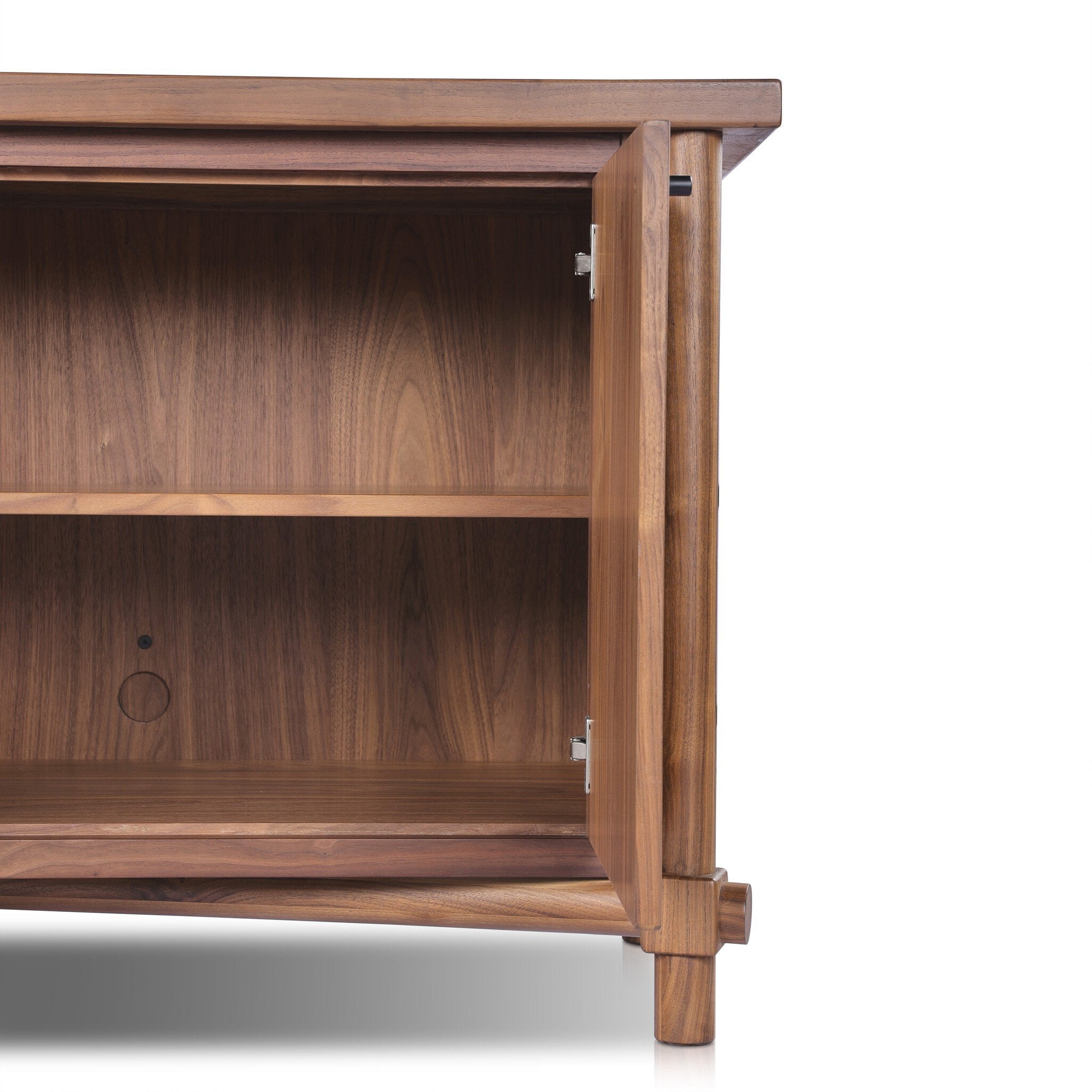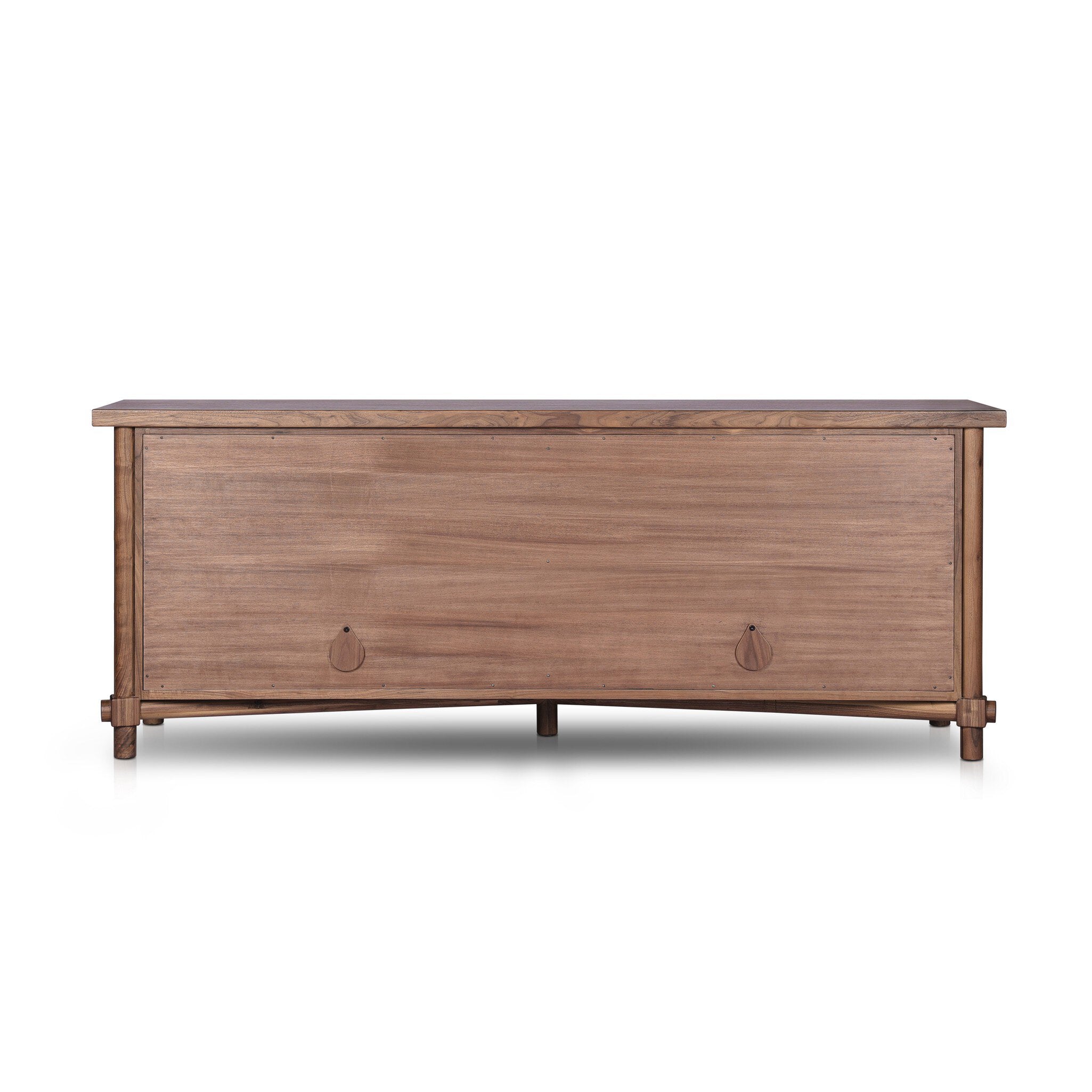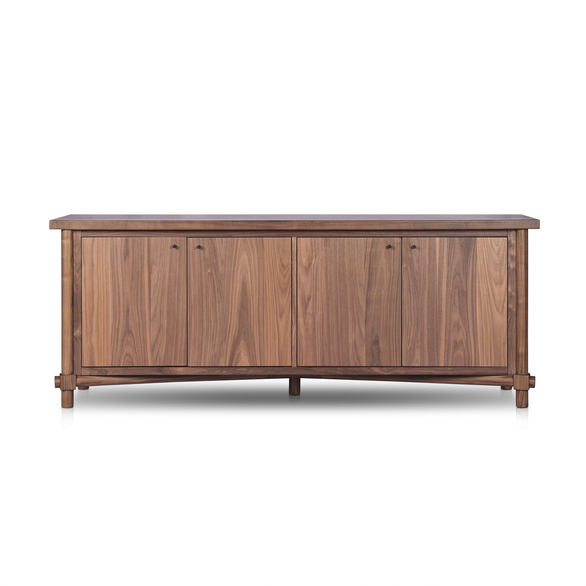 This sideboard embodies a safari feel with its natual walnut finish and architectural take on the lower joint construction. With outset legs and an overhanging top, the piece creates a cradle look that adds a layer of interest to functional form.