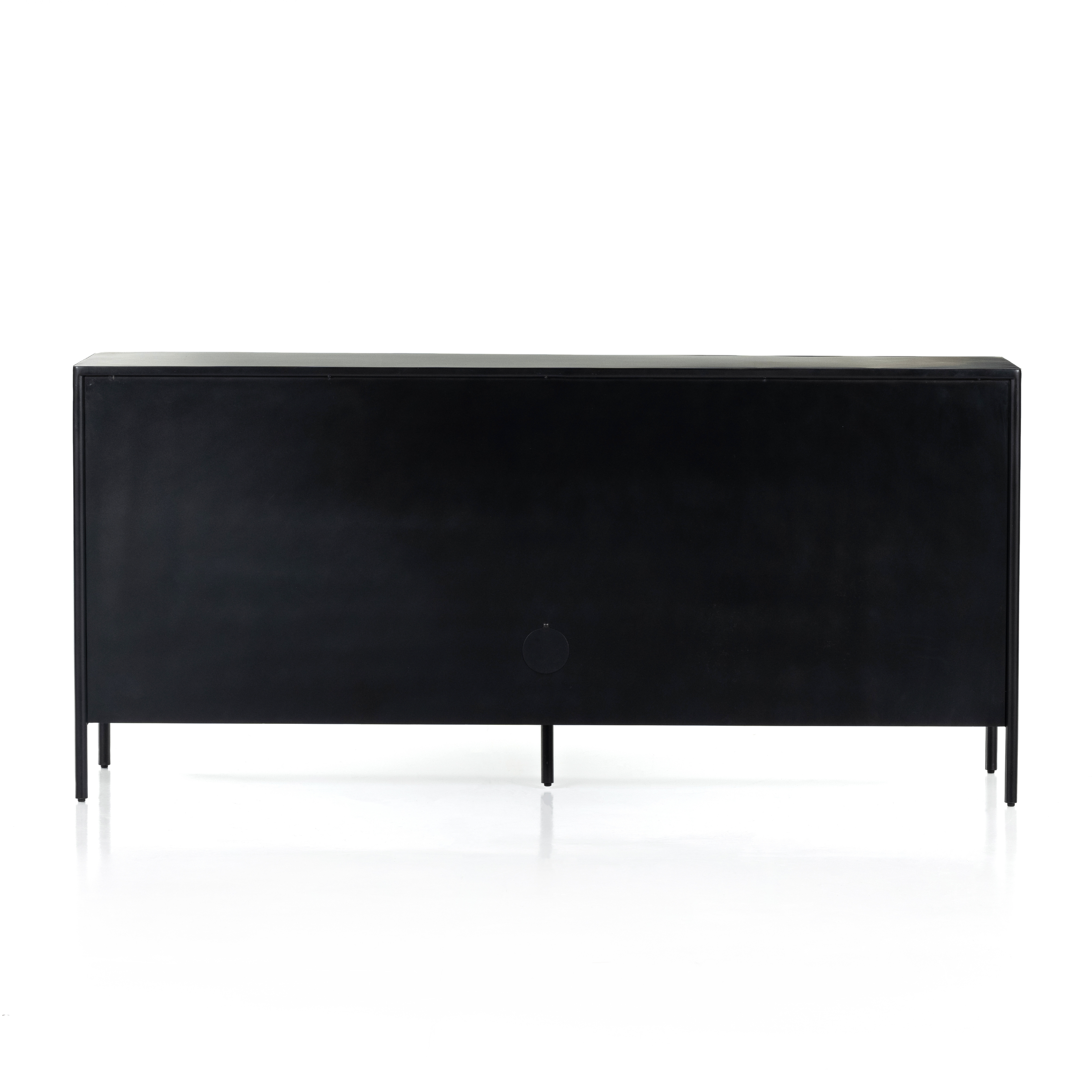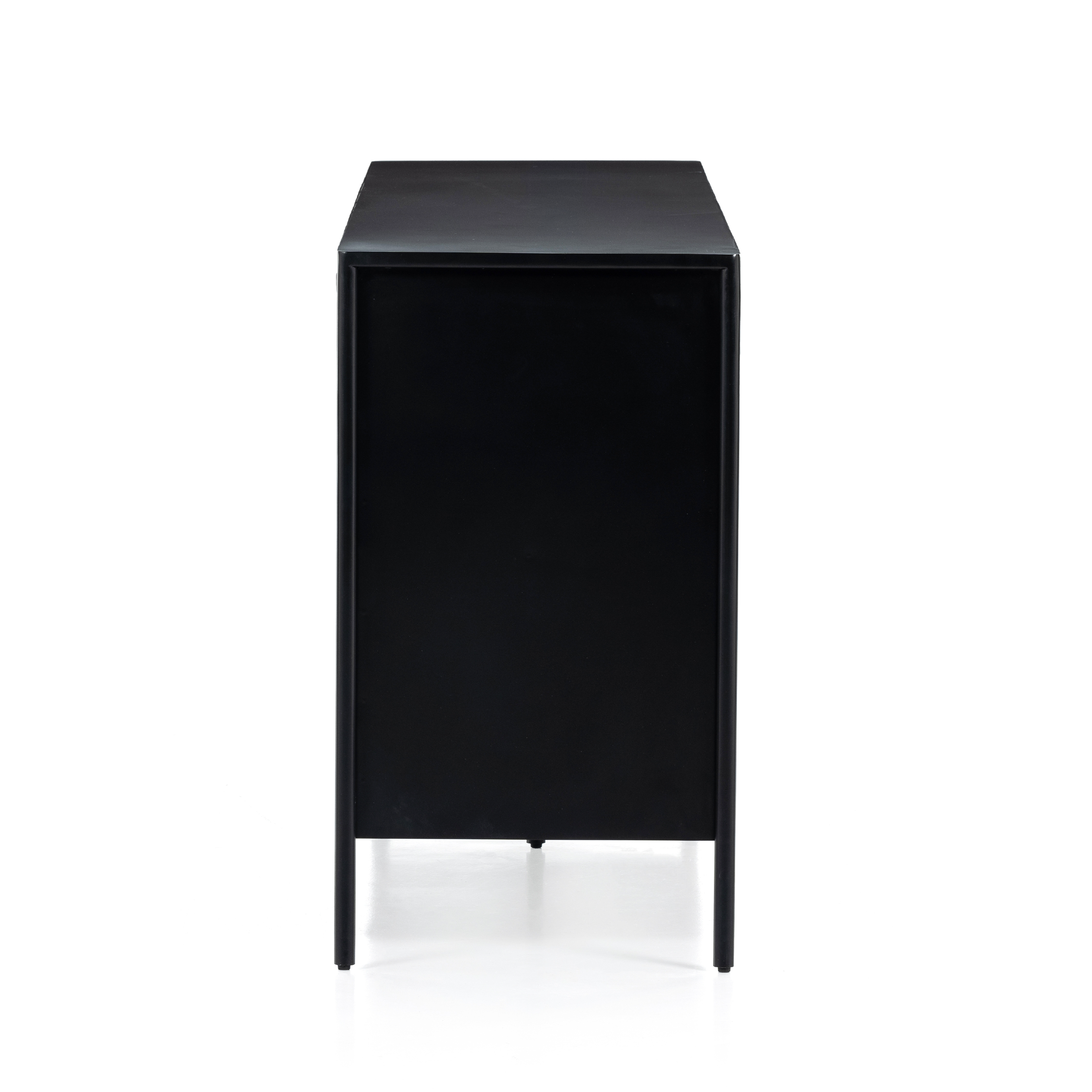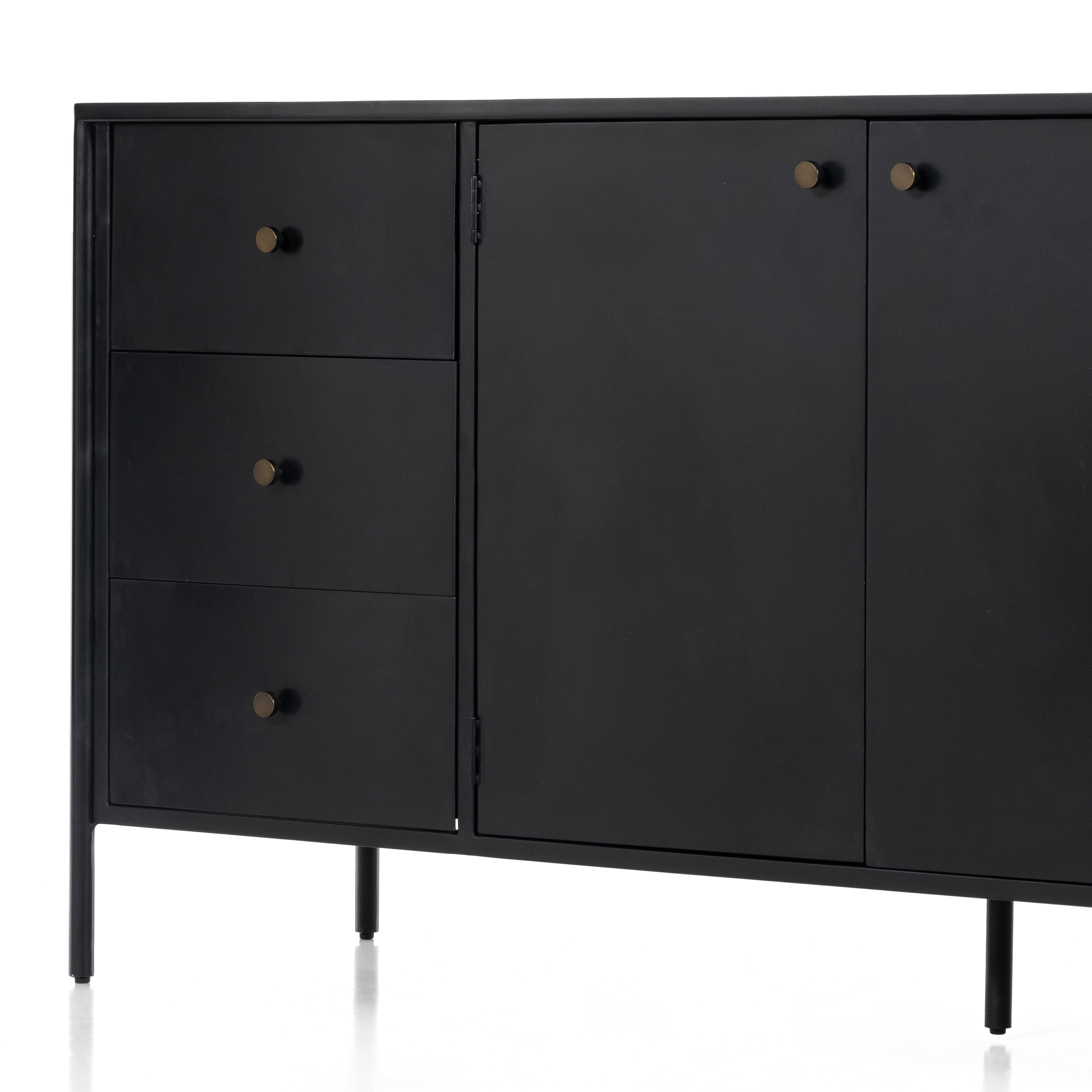 Bring a softened industrial look to the dining room with a simple black-finished iron Soto Black Sideboard featuring bronzed iron hardware for modernity. Three roomy drawers plus generous closed cabinetry offer ample storage area for table linens, serveware and more.