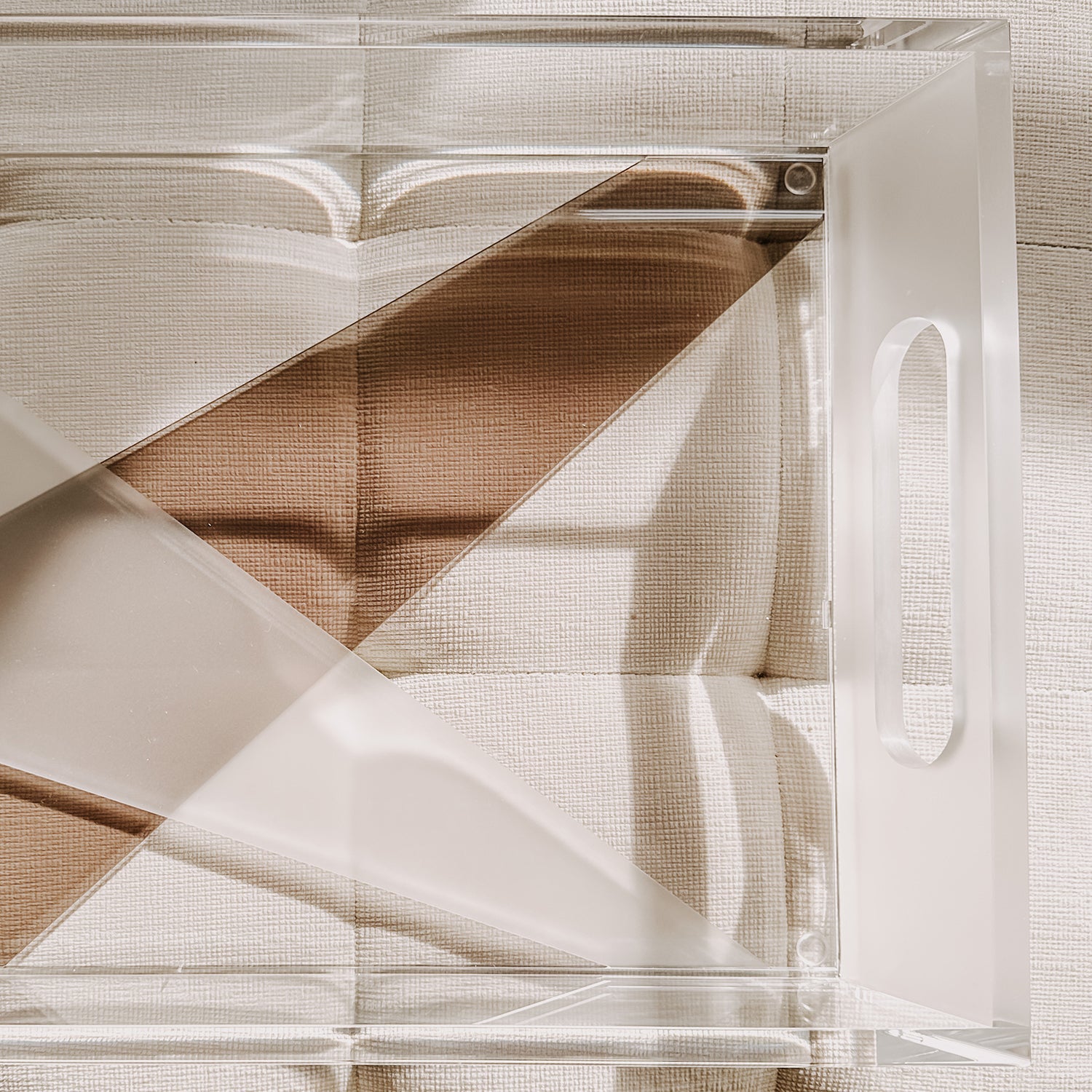 The Manhattan Tray features layers of acrylic in the base that take advantage of negative space to create a 3-dimensional effect with the triangle patterns. Featuring various color combinations that meld together with a diamond-polished seam.