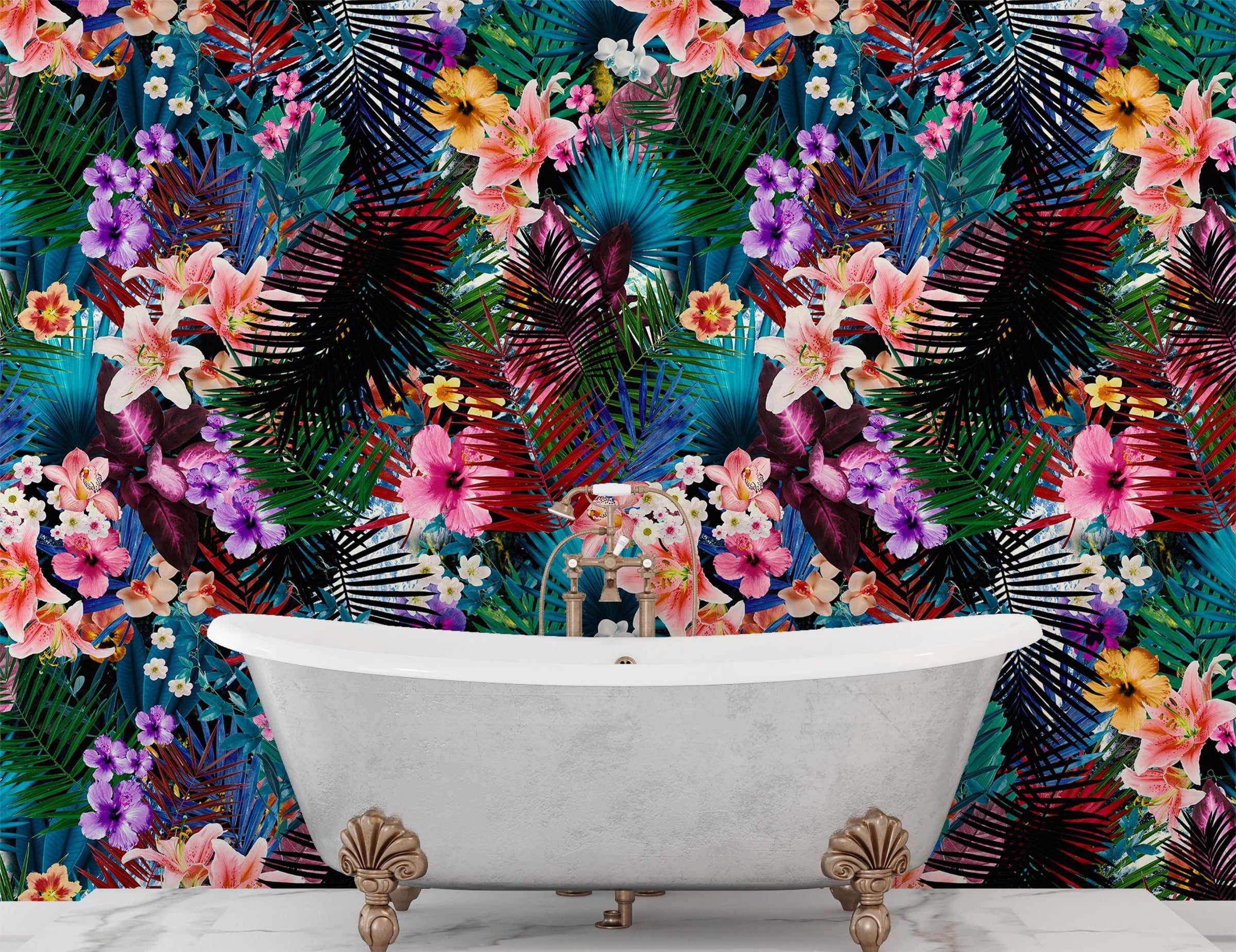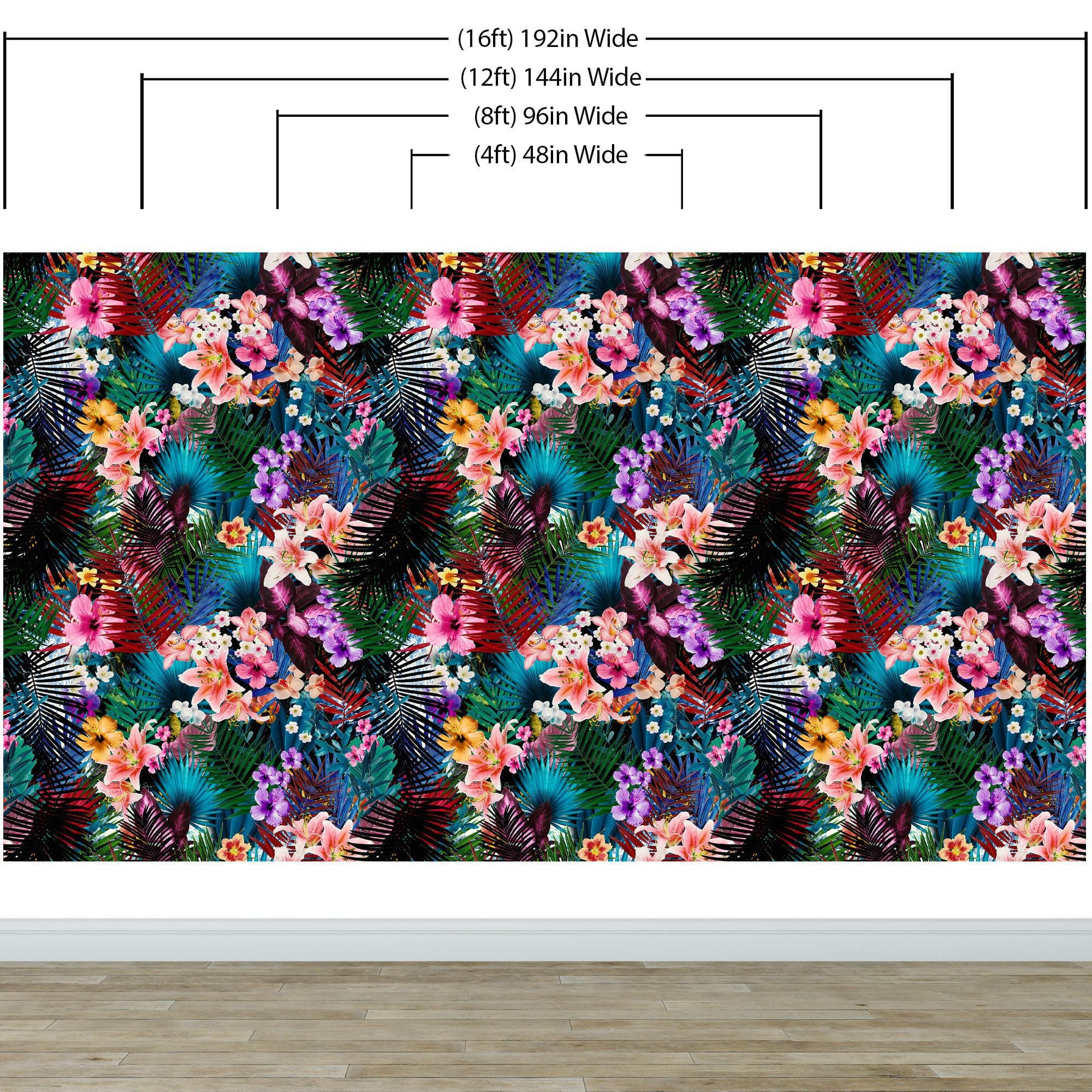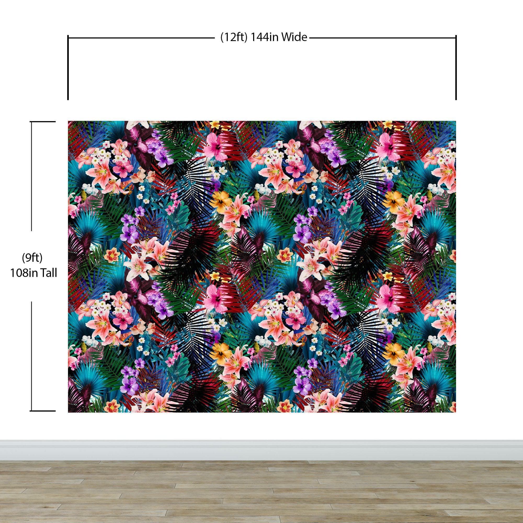 Colorful Tropical Foliage Pattern Wall Mural. Peel and Stick Wallpaper