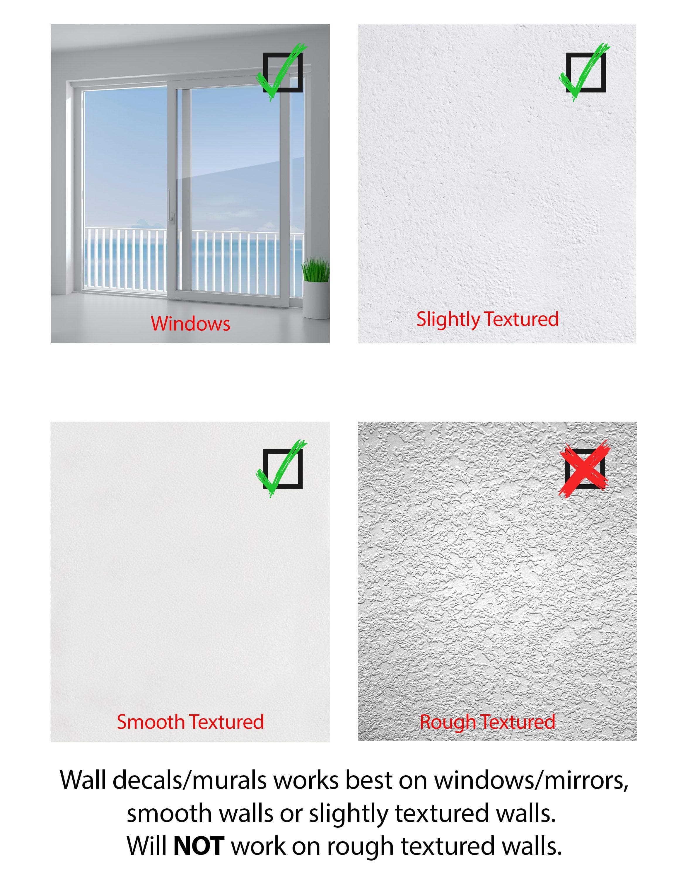 - Stickerbrand Wall Murals can be applied on most flat surfaces, including slightly textured walls, windows or mirrors. Will Not work on heavily textured walls. Not for outdoor use.