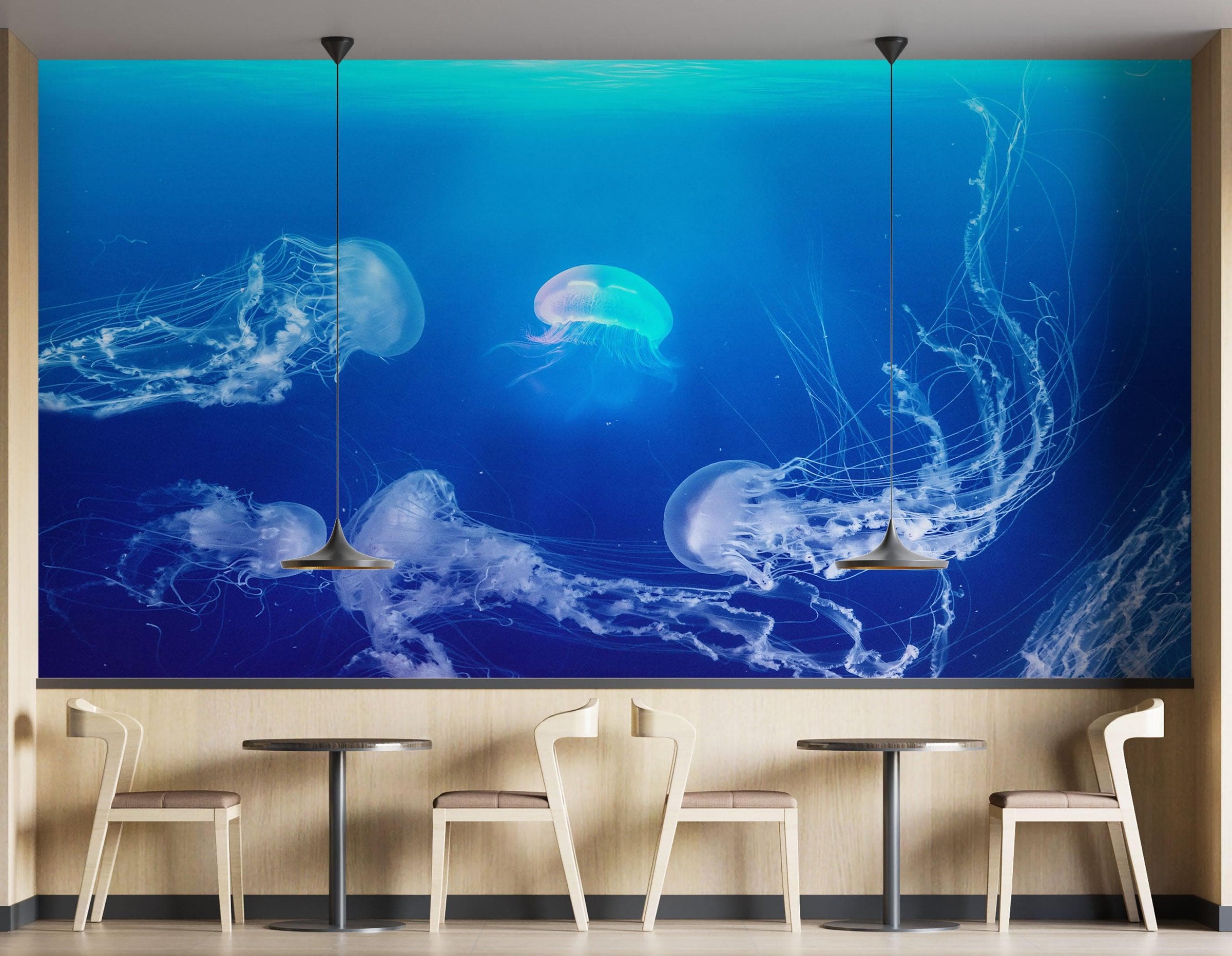 Jellyfish Floating Underwater Wall Mural. Deep Blue Ocean Peel and Sti