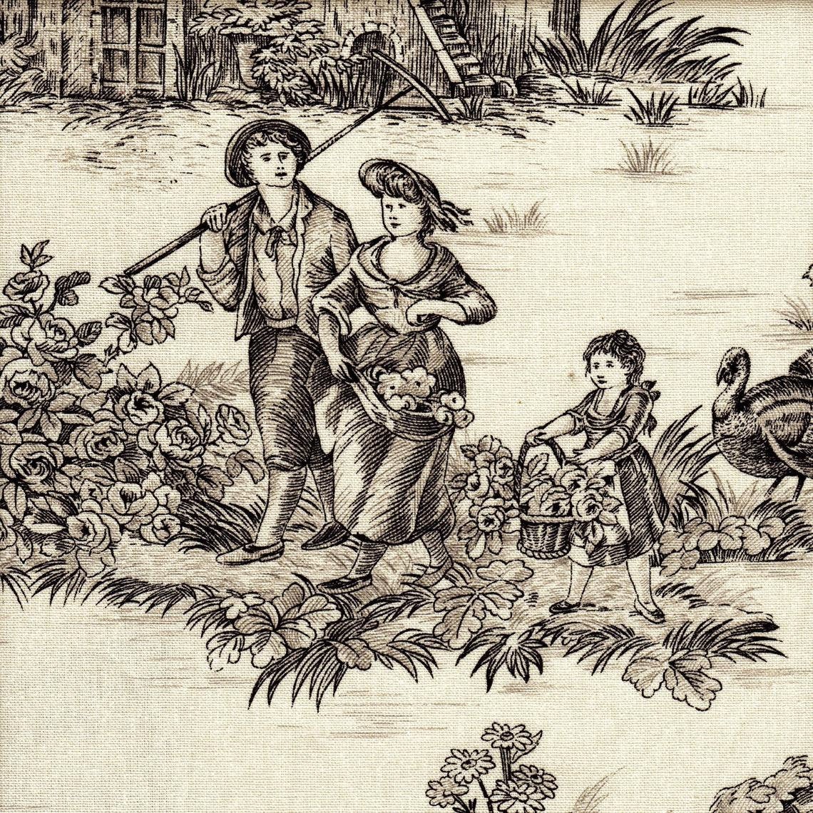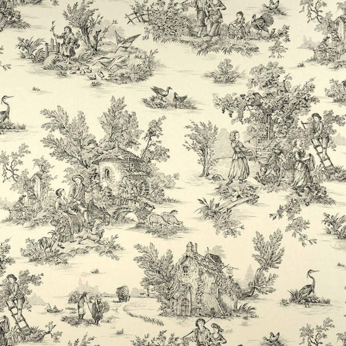 Get the real thing! That perfect Toile de Jouy you've been searching for is imported for us directly from France. These enchanting scenes of French country life are simply delightful. Pastorale #1 is black on a cream background.