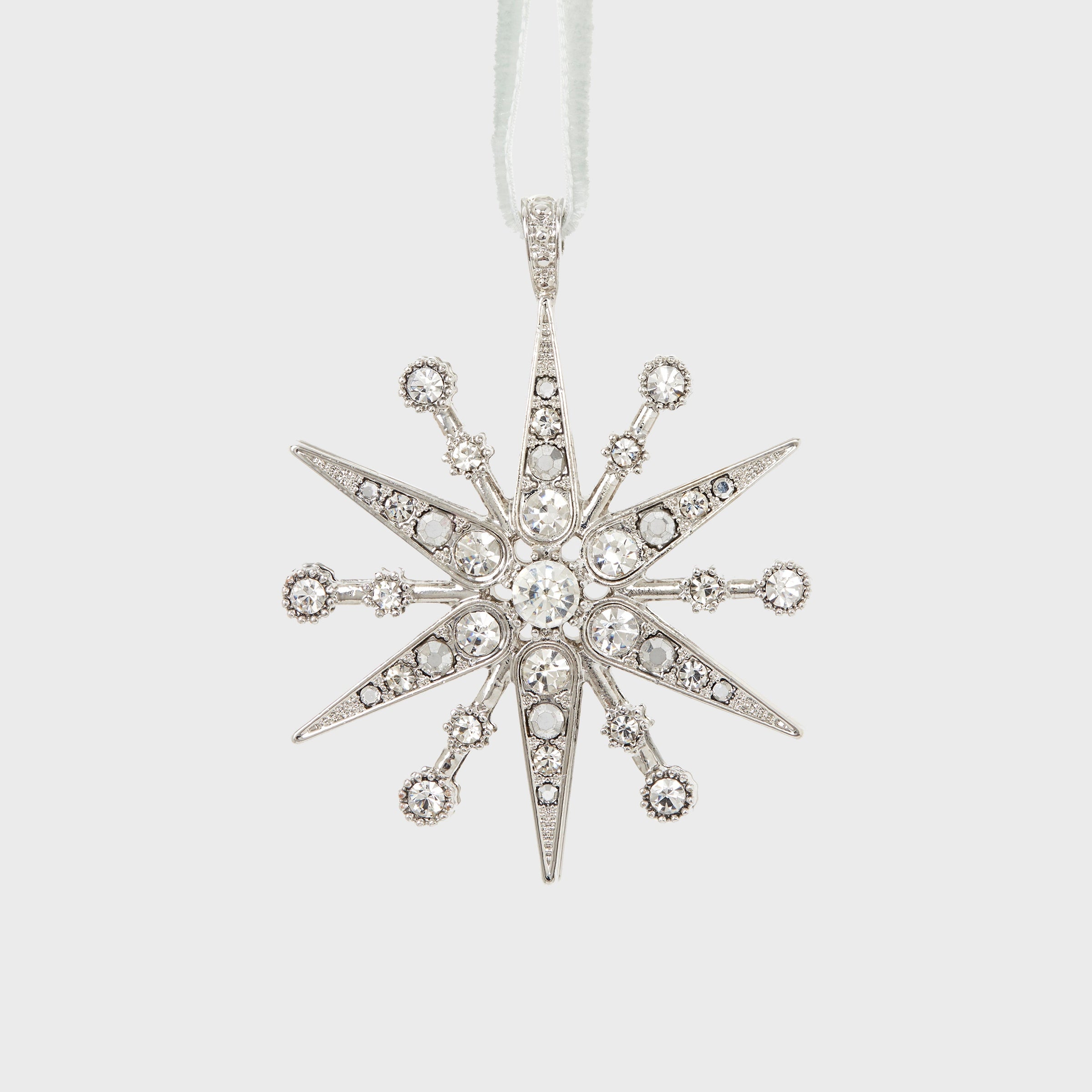 Very inspired by Art Deco, and this snowflake hanging ornament is no exception! Sparkling cool tones of silver and crystal stones really shine on this ornament. Equal parts star and snowflake, we are so happy to be bringing such a stylish friend into our constellation!
