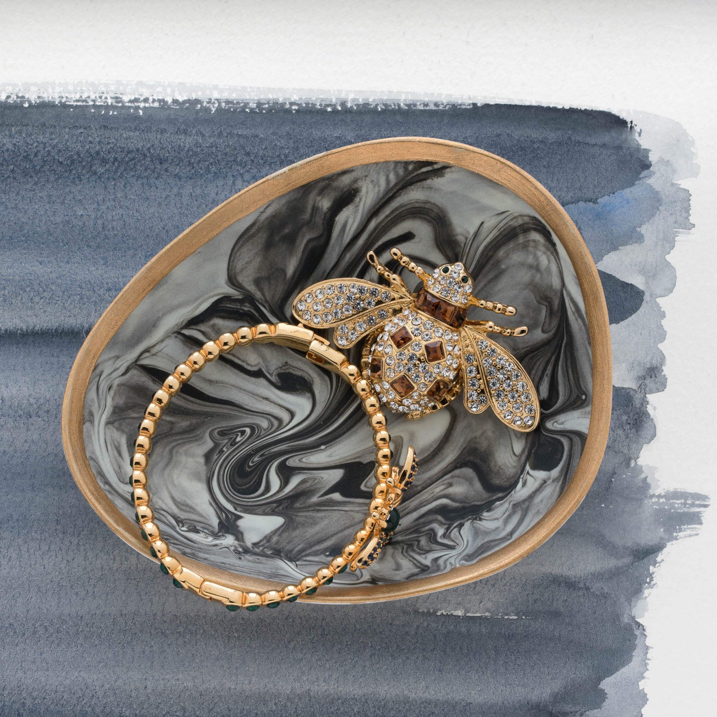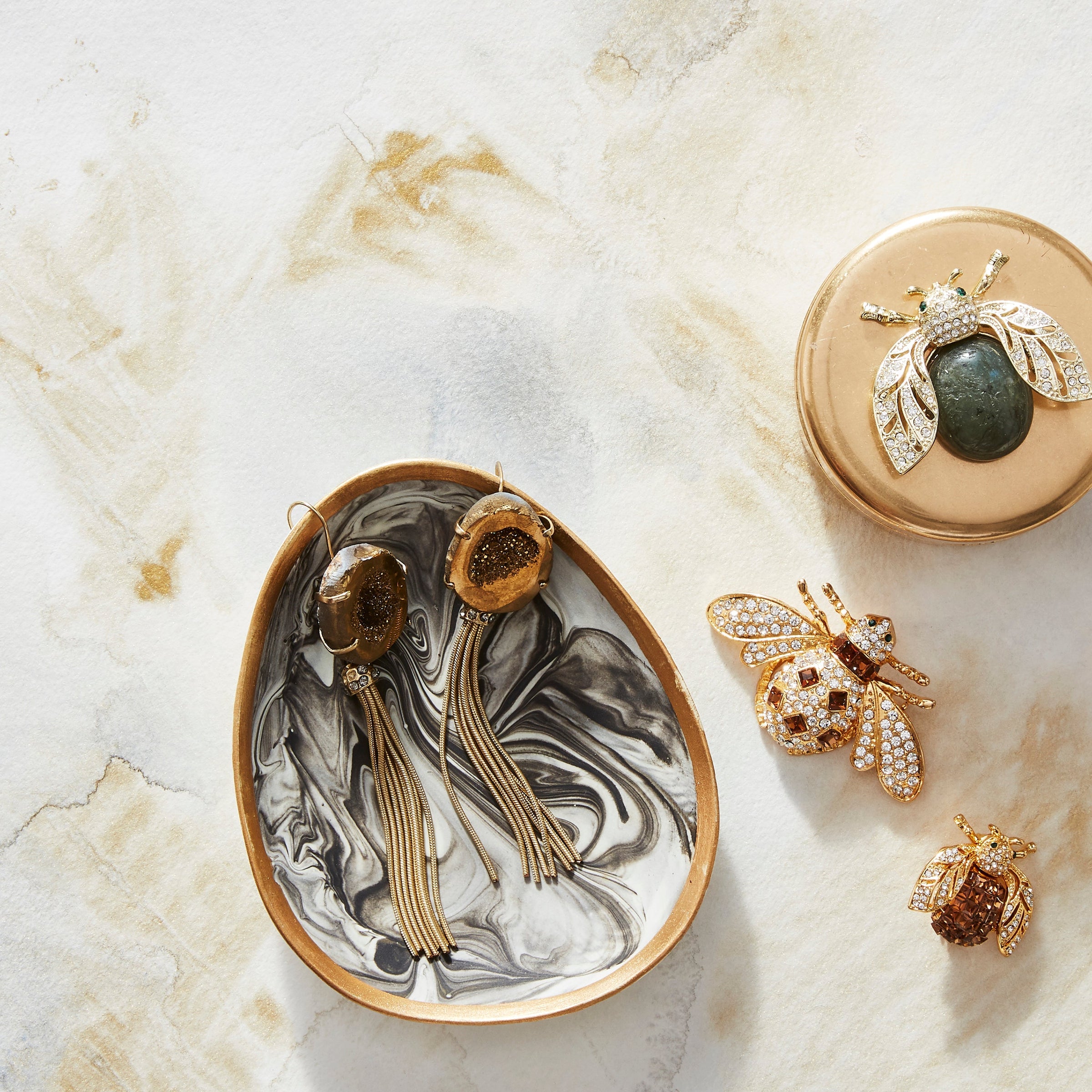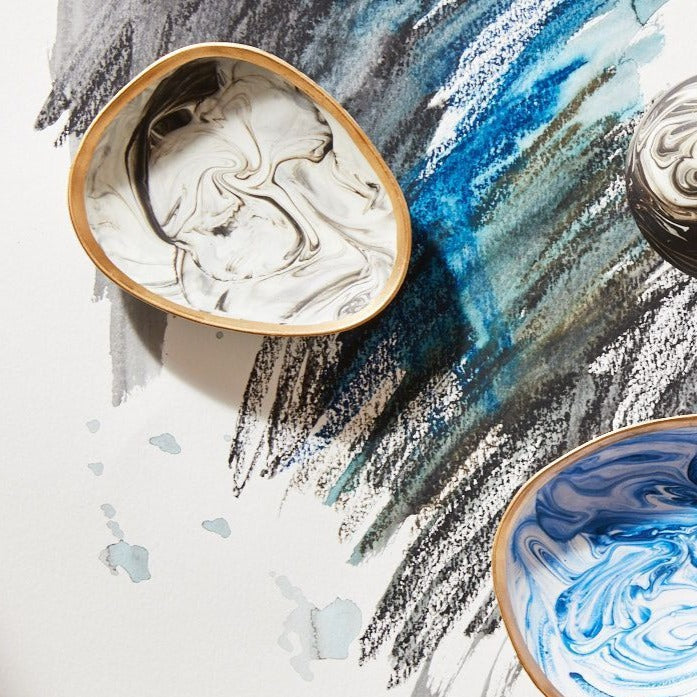 I drew the shape of this dish and had the wonderful artisans in the Philippines craft this for us. Porcelain, hand marbled, with a real gold edge. Who's jewels wouldn't want to rest here at night!?
