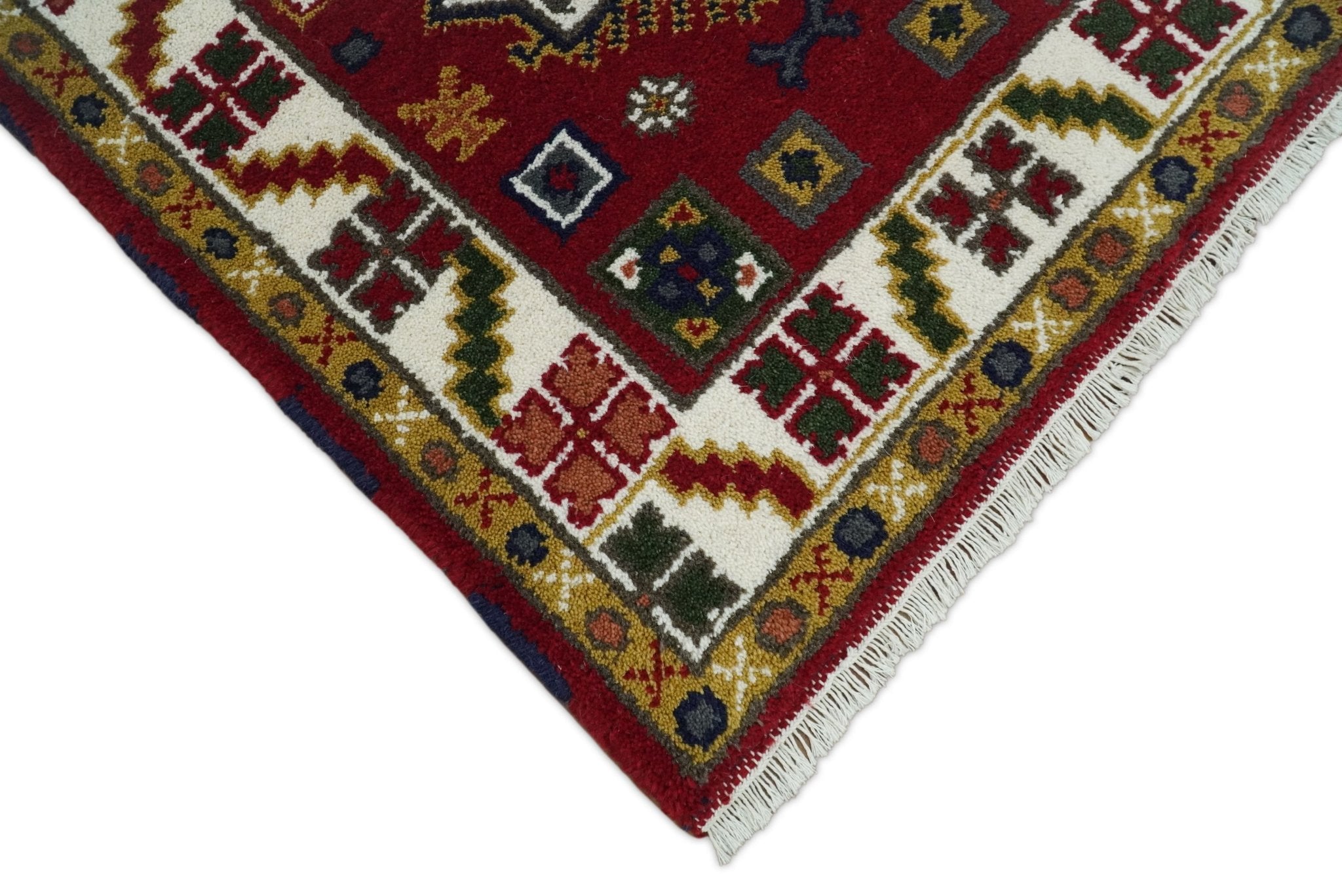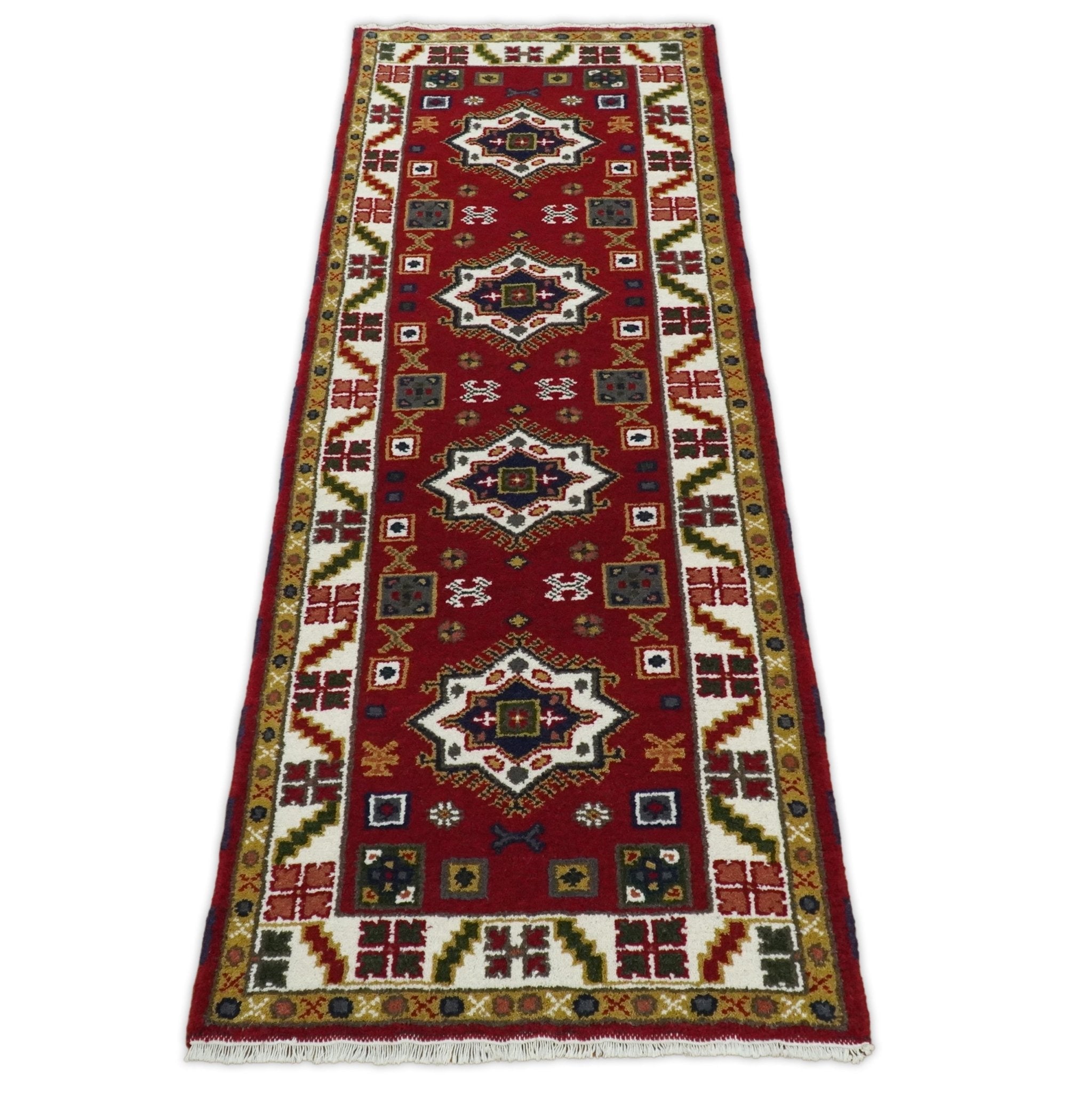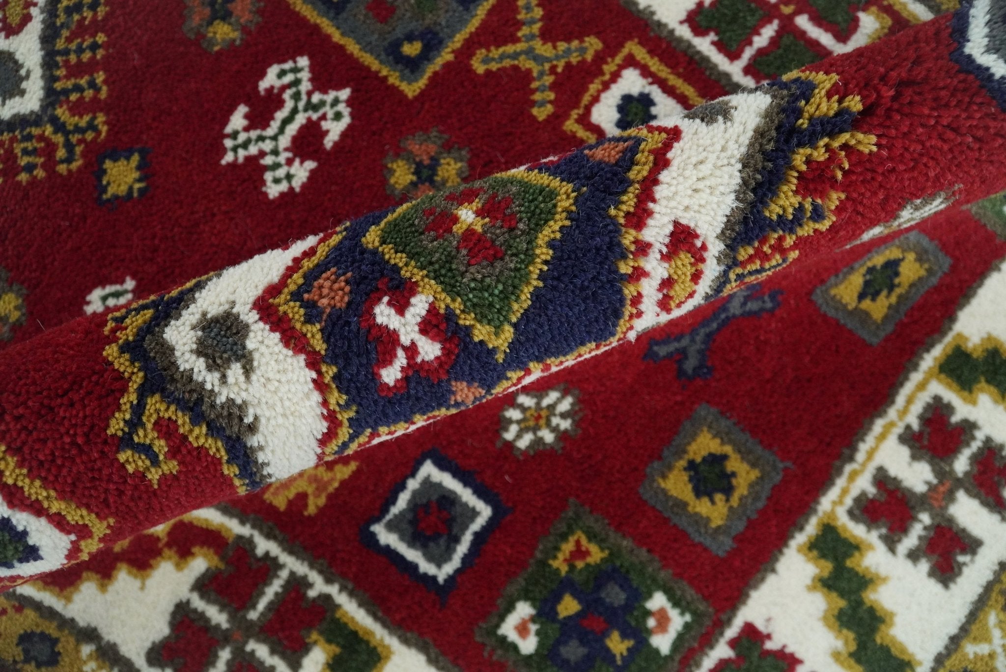 This Hand-Knotted Rug has been Made with Handspun Wool. The beautiful colors of the rug carry a legacy of the Kazak rug. The traditional design of the rug completes your space without making it look busy. Hand-Knotted rugs are durable and can last for decades if treated right.