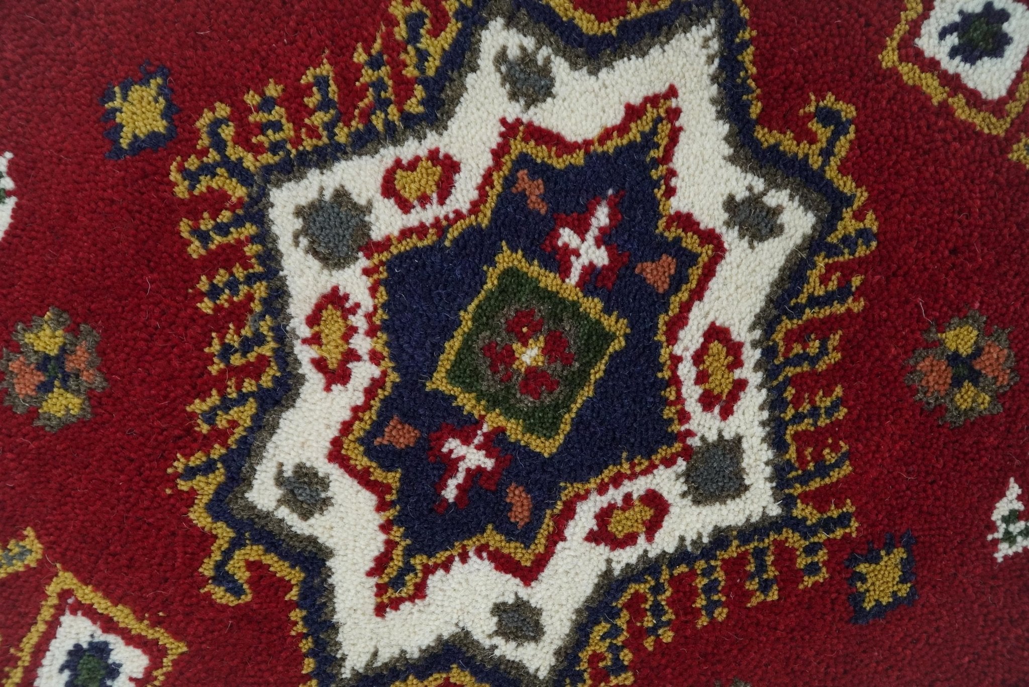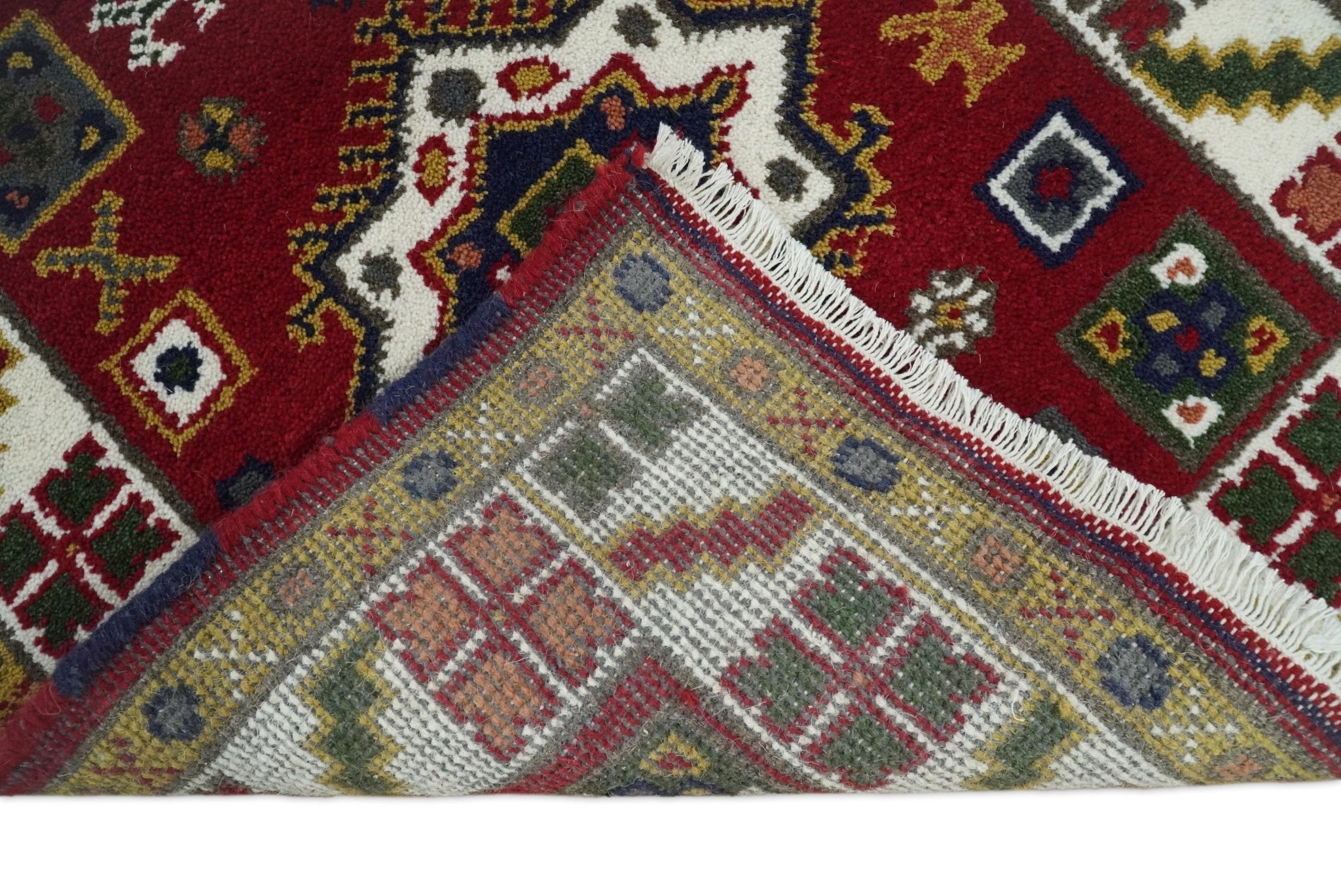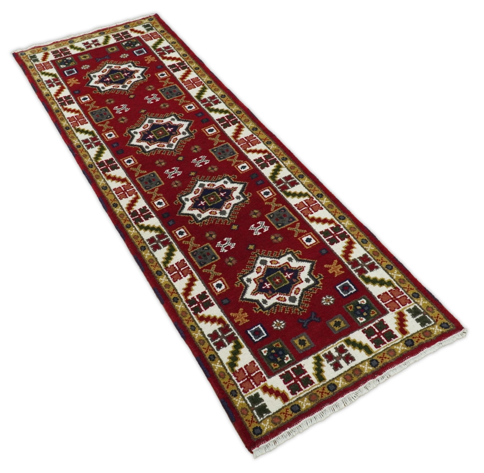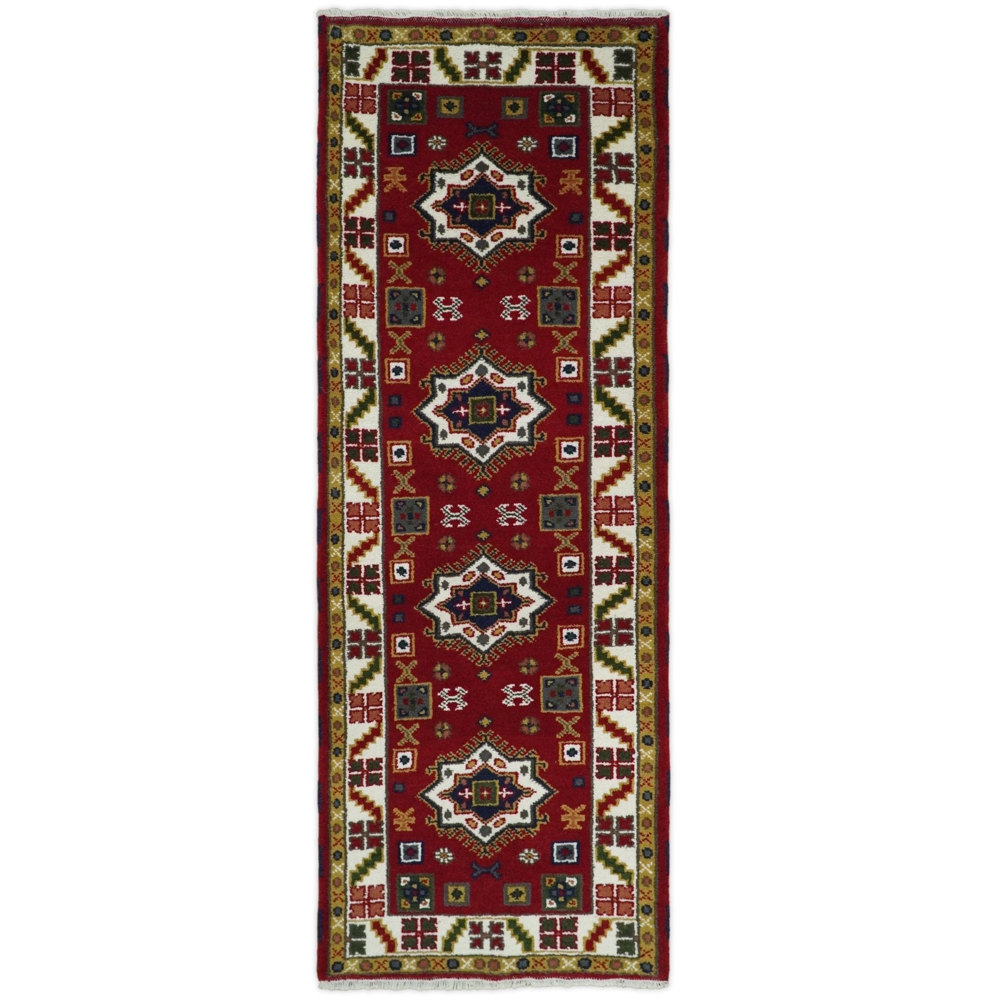 This Hand-Knotted Rug has been Made with Handspun Wool. The beautiful colors of the rug carry a legacy of the Kazak rug. The traditional design of the rug completes your space without making it look busy. Hand-Knotted rugs are durable and can last for decades if treated right.