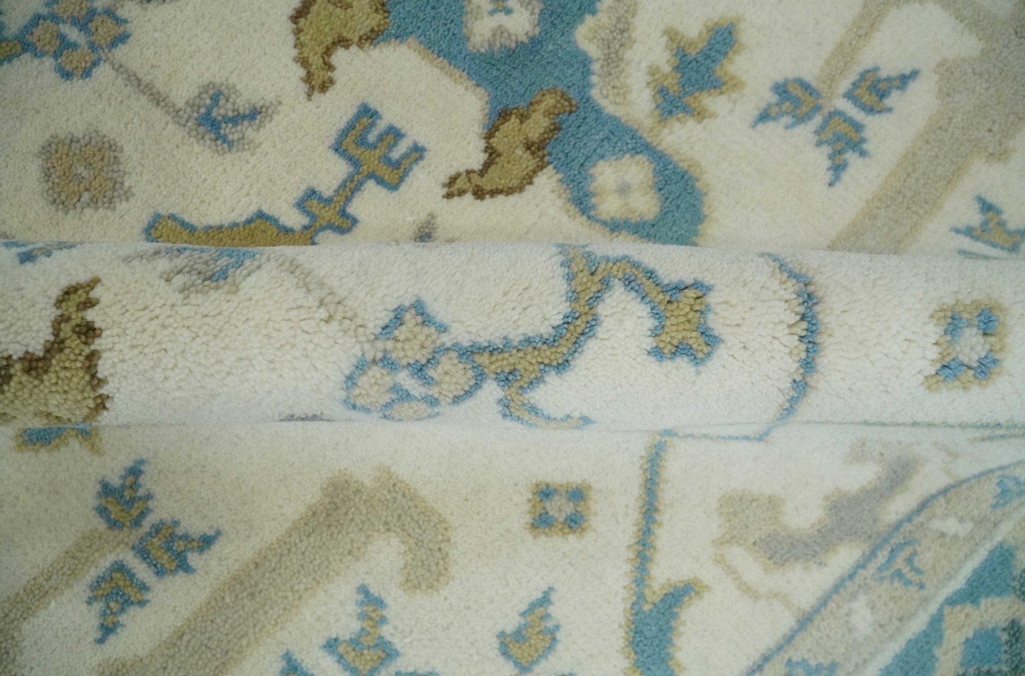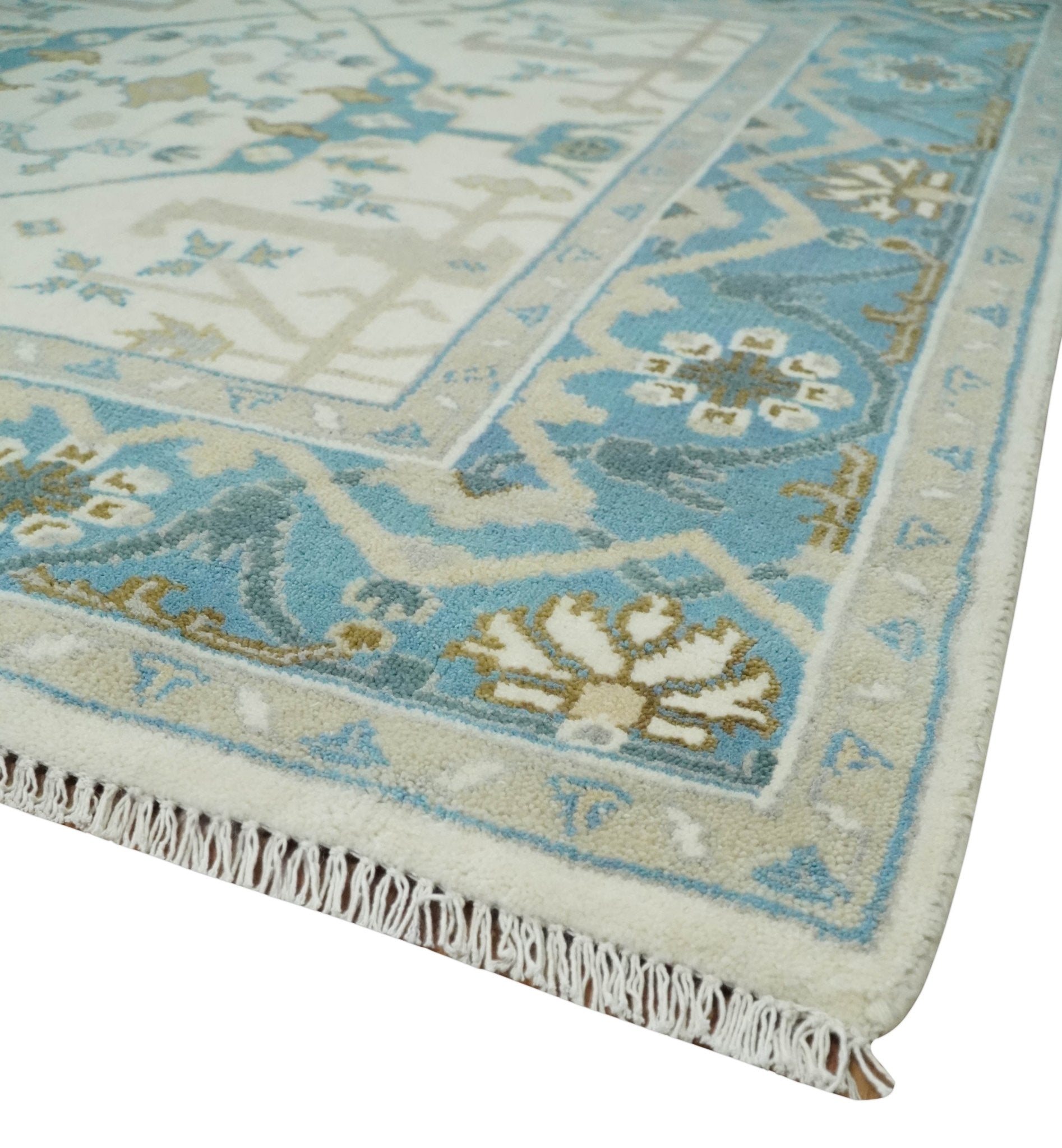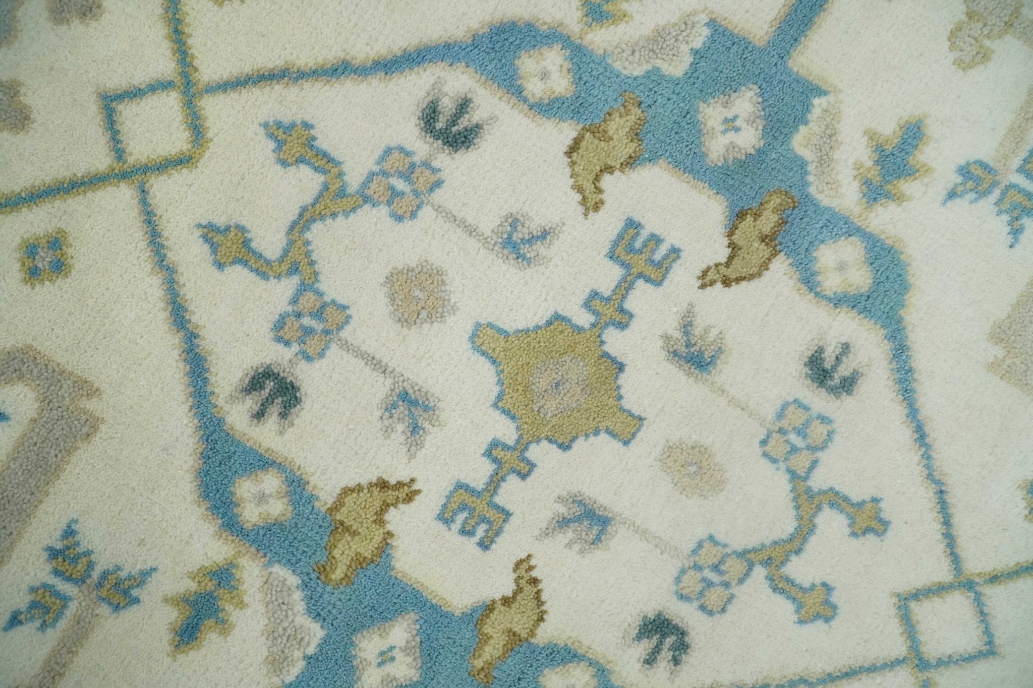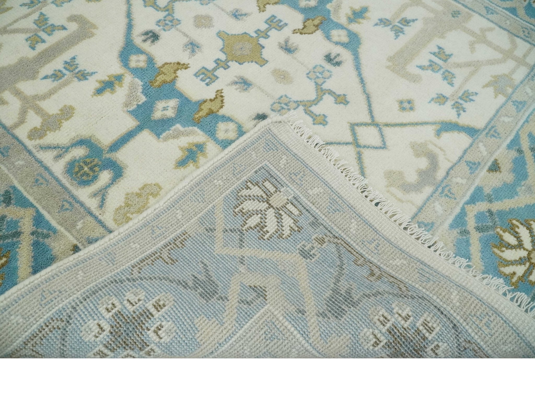 The Oriental Oushak design with a classic color combination of Ivory, Aqua and Beige gives it an antique look. The rug is made with fine Wool. It is a perfect pick to give your interior a classic feel.