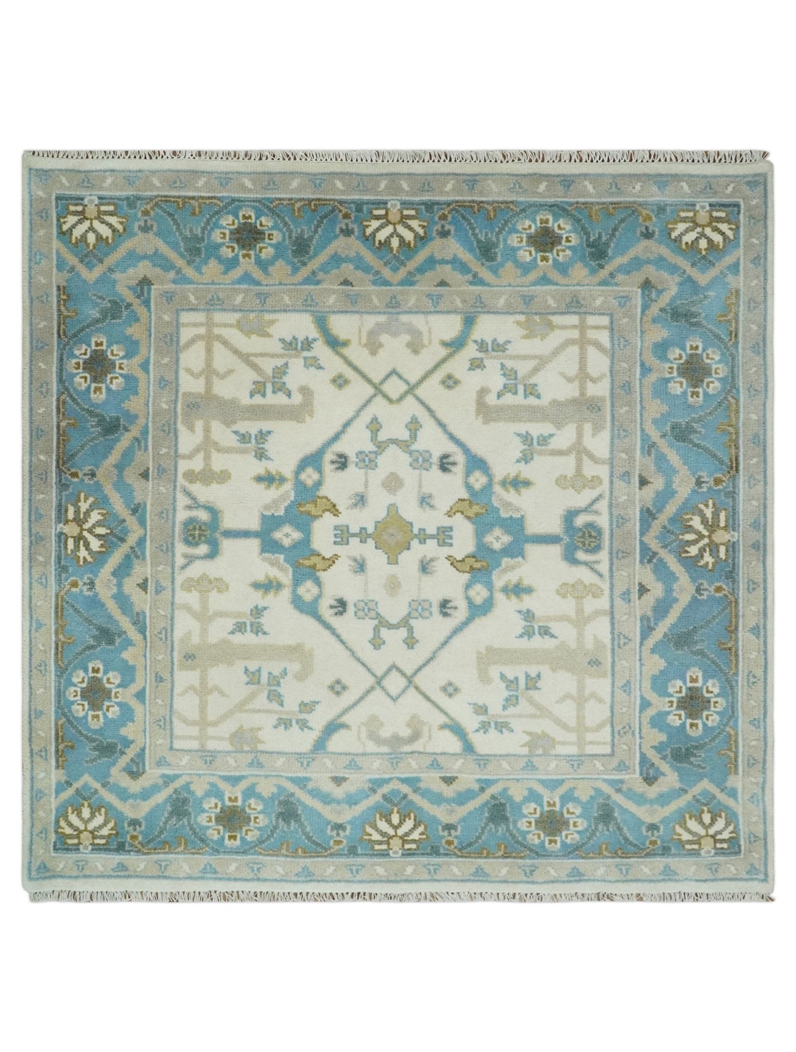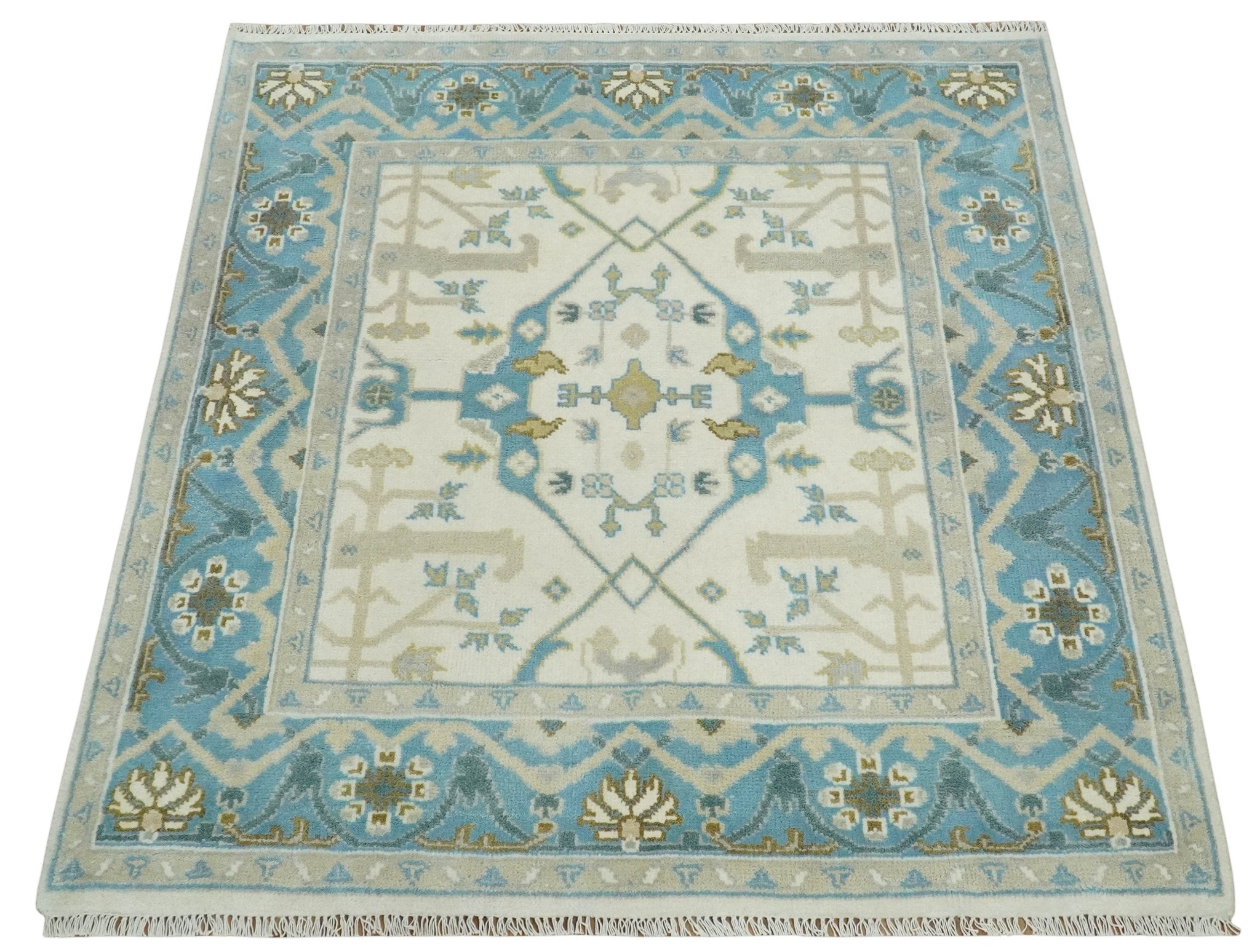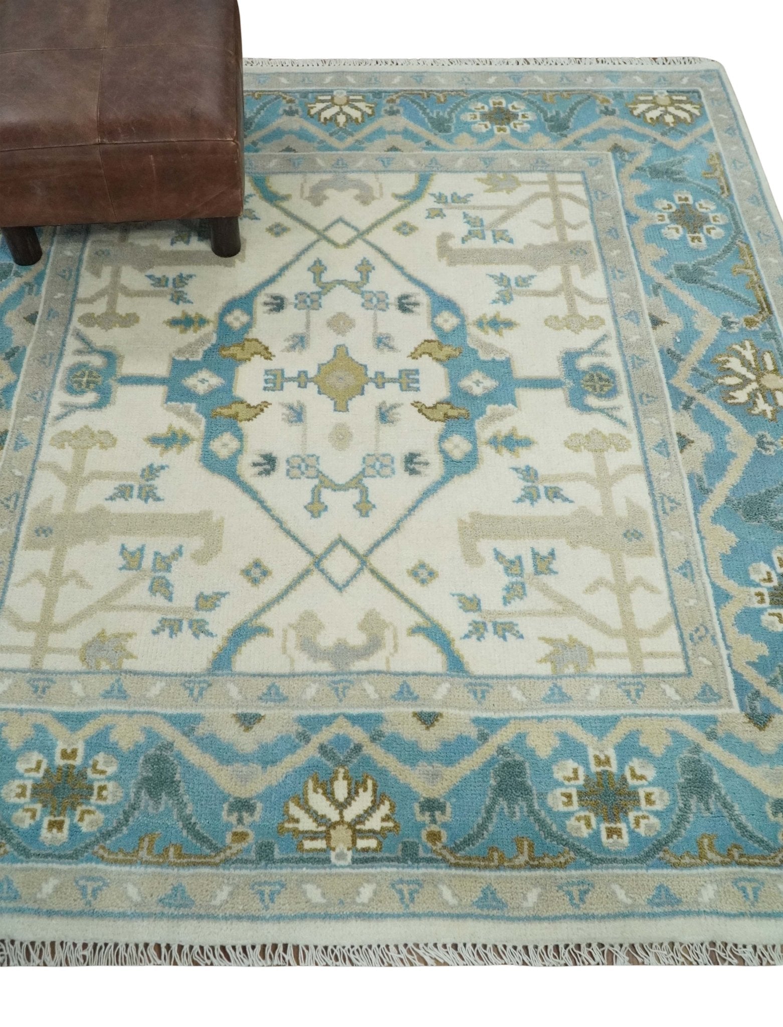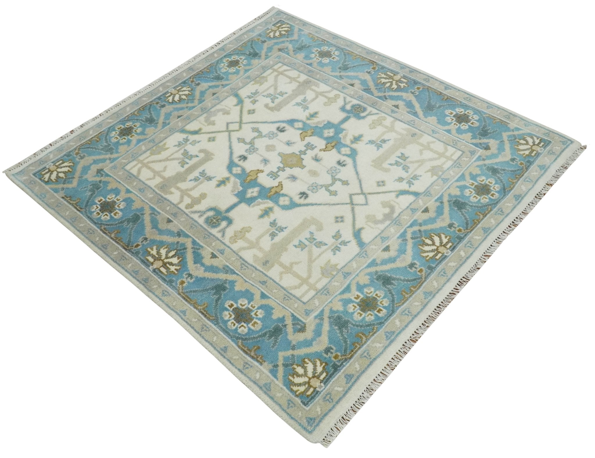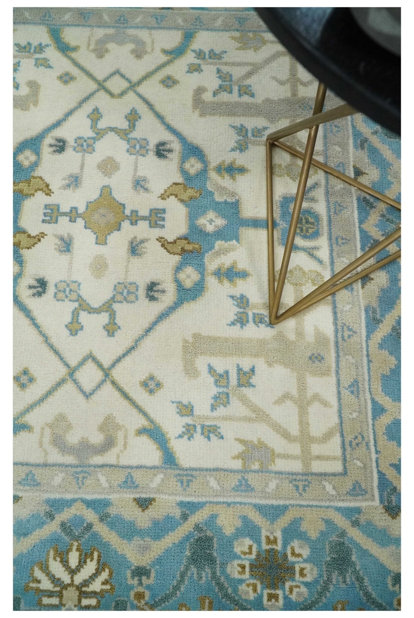 The Oriental Oushak design with a classic color combination of Ivory, Aqua and Beige gives it an antique look. The rug is made with fine Wool. It is a perfect pick to give your interior a classic feel.