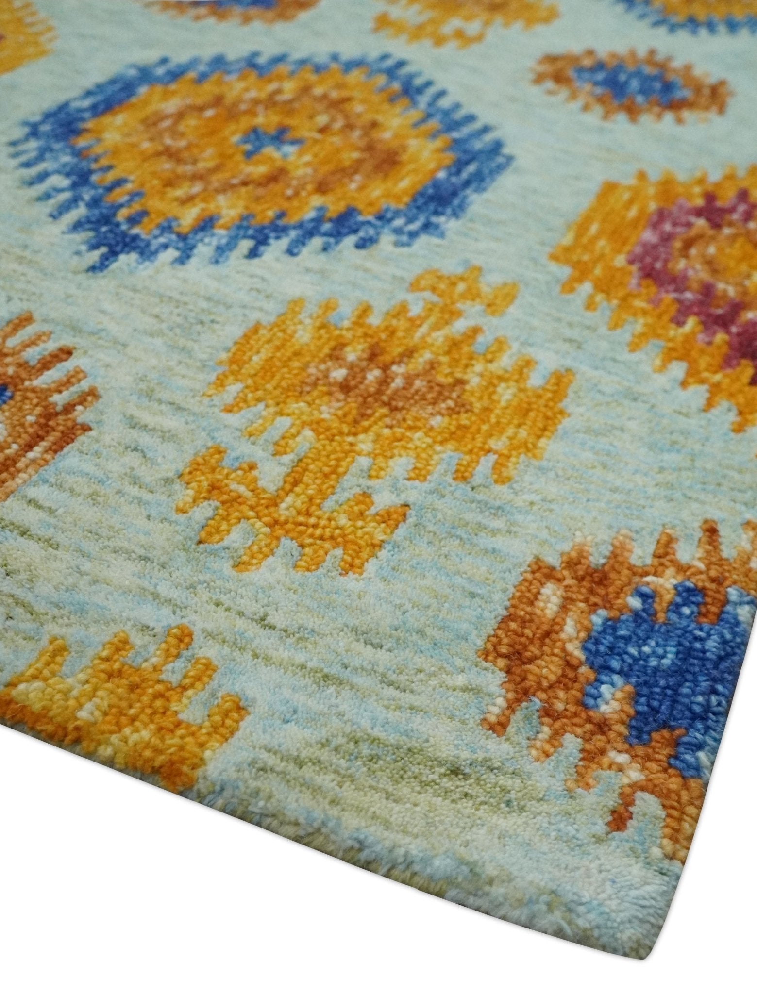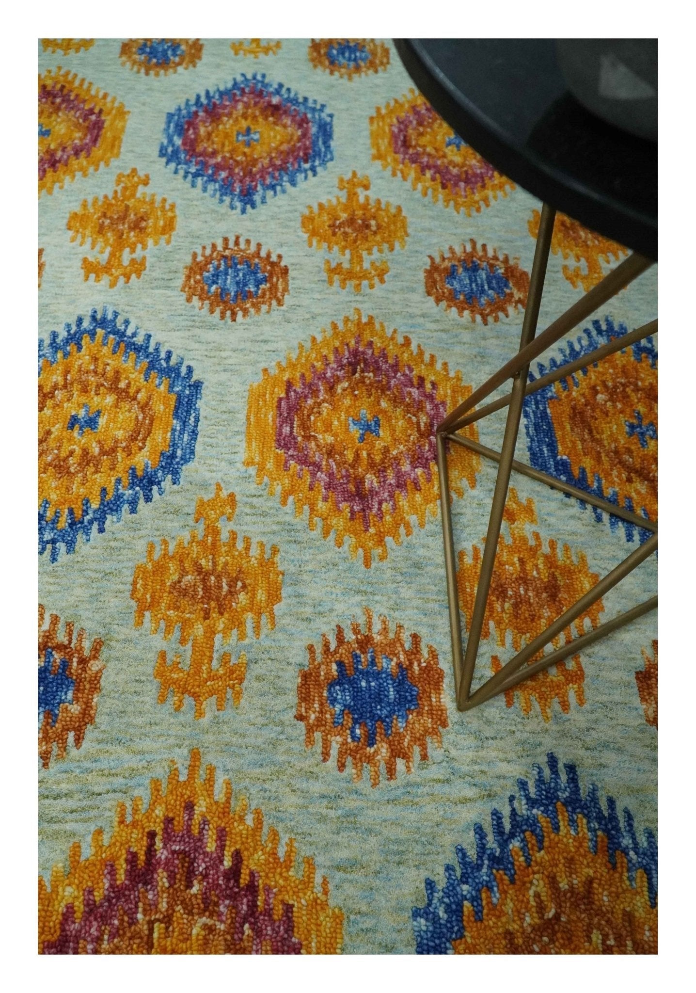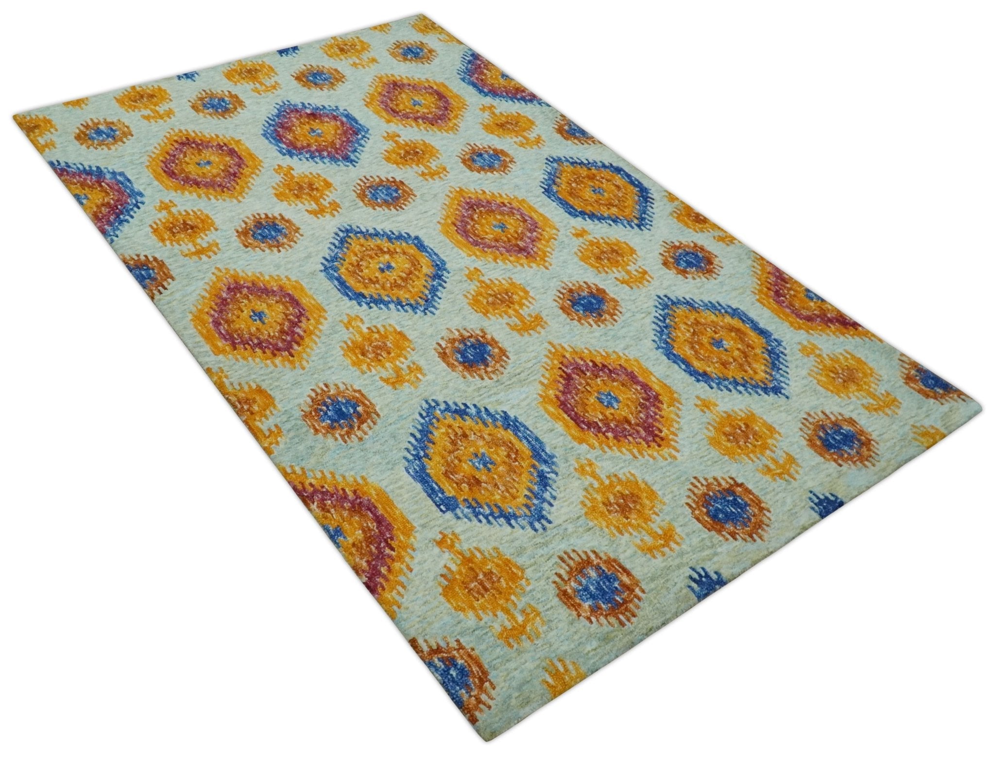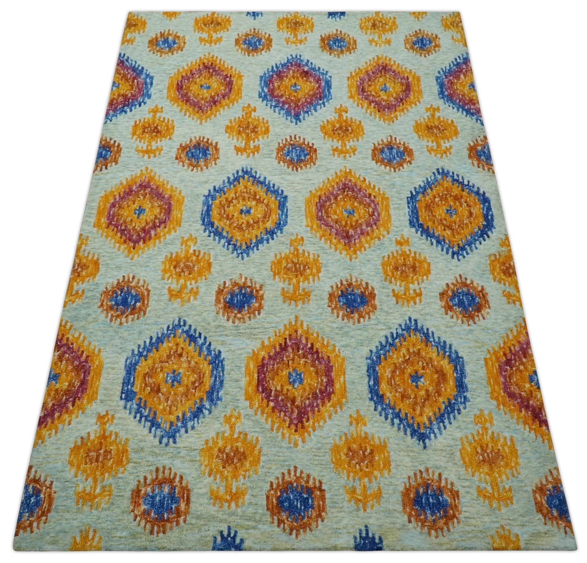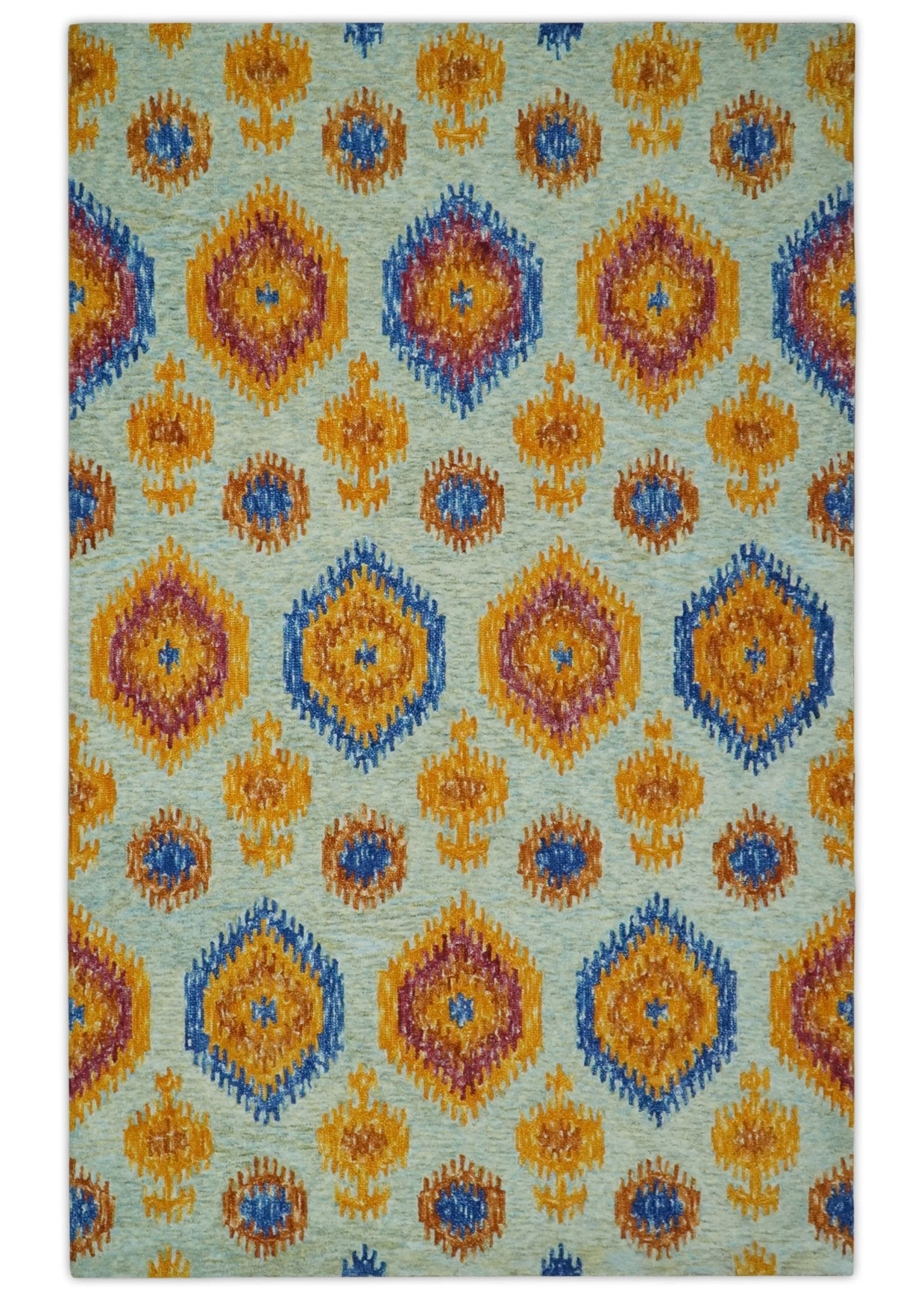This 5x8 traditional ikat design rug is hand tufted from soft wool and features a classic three-tone ivory, gold, and blue color scheme. Enjoy a luxurious feel and contemporary sophistication in any room. Perfect for adding warm elegance to your home.