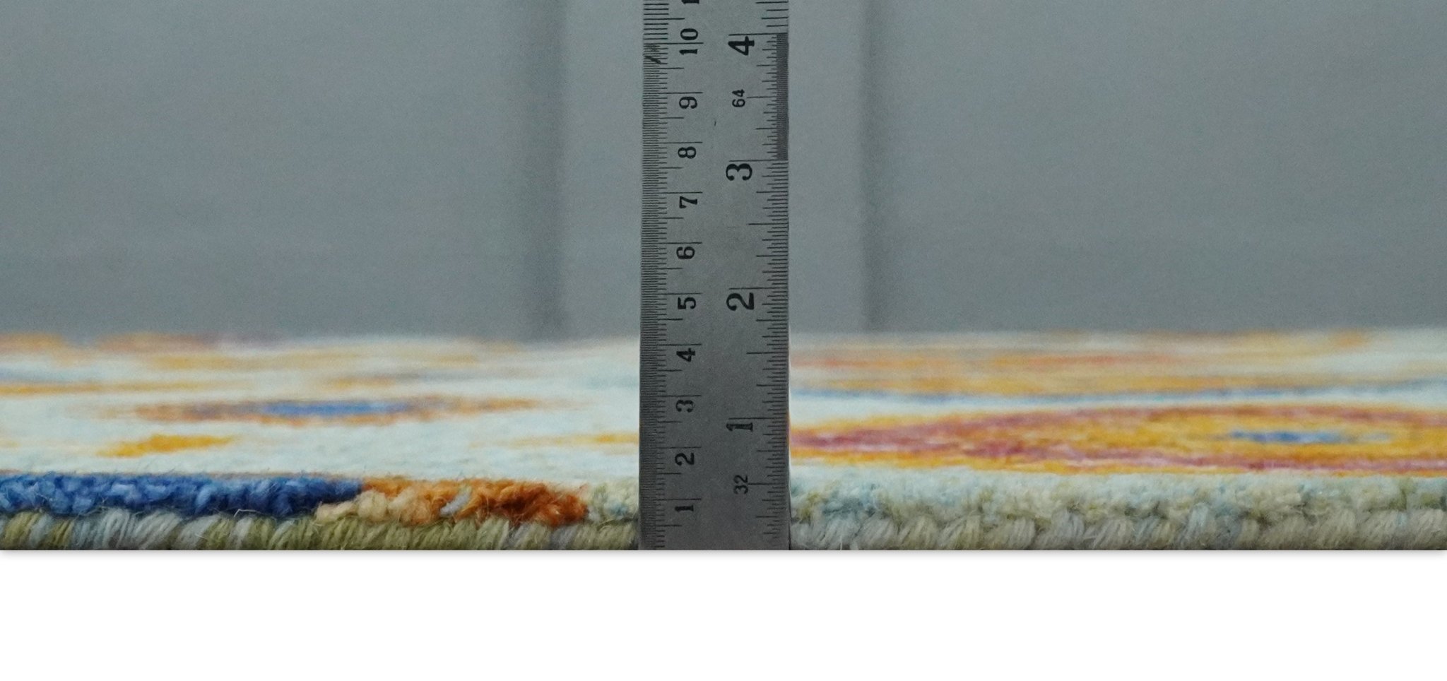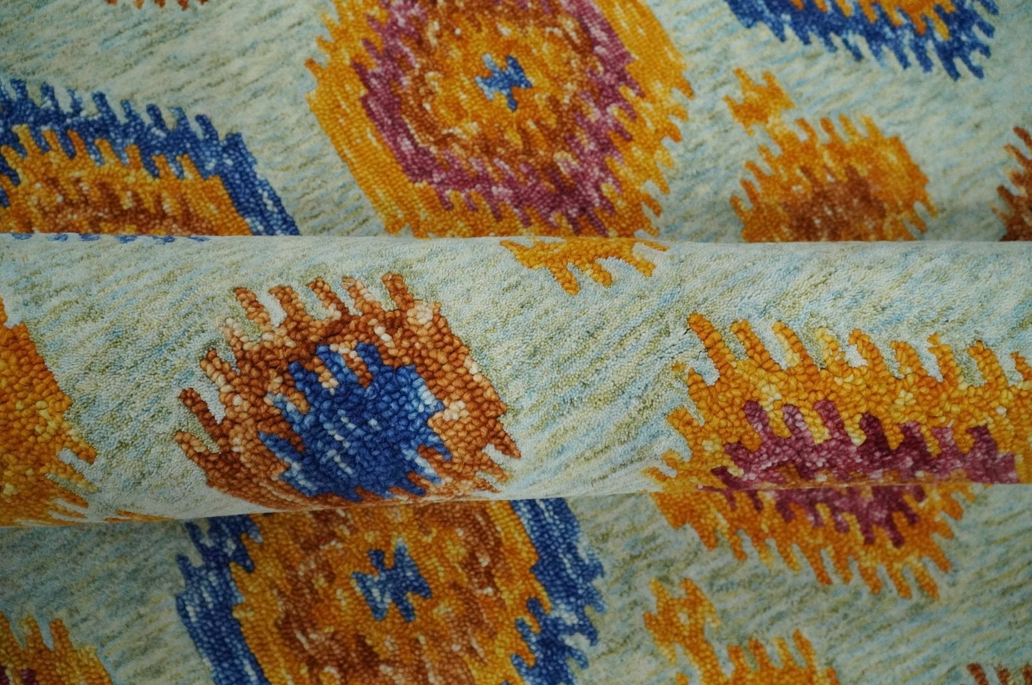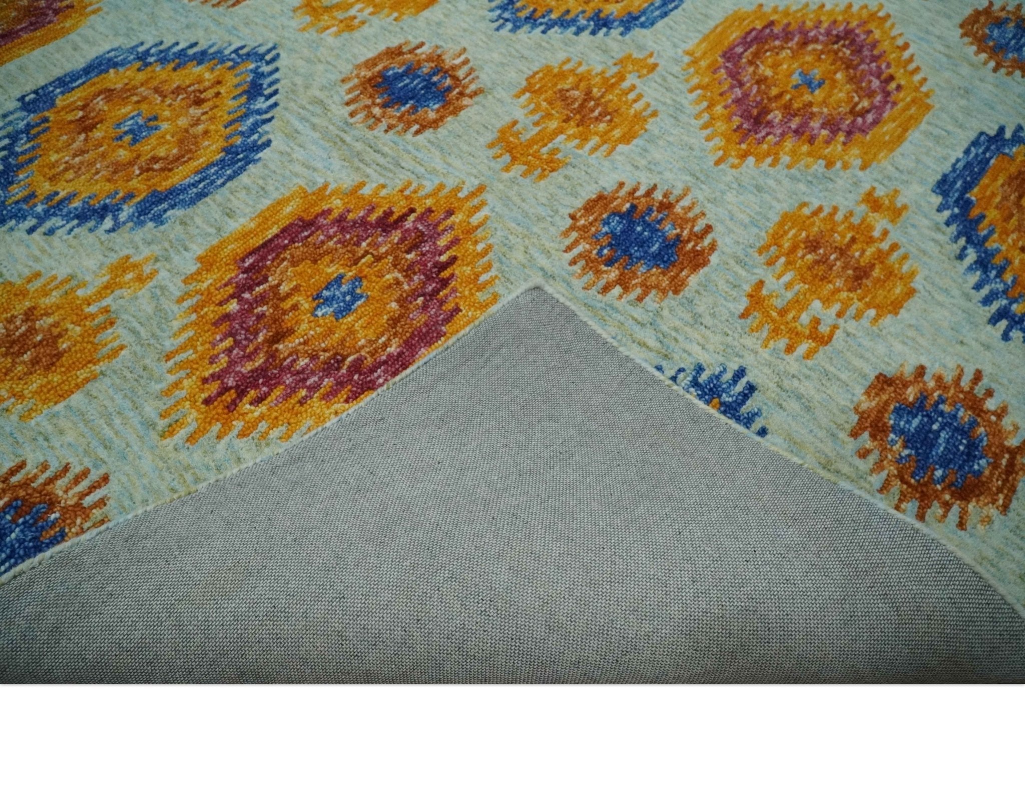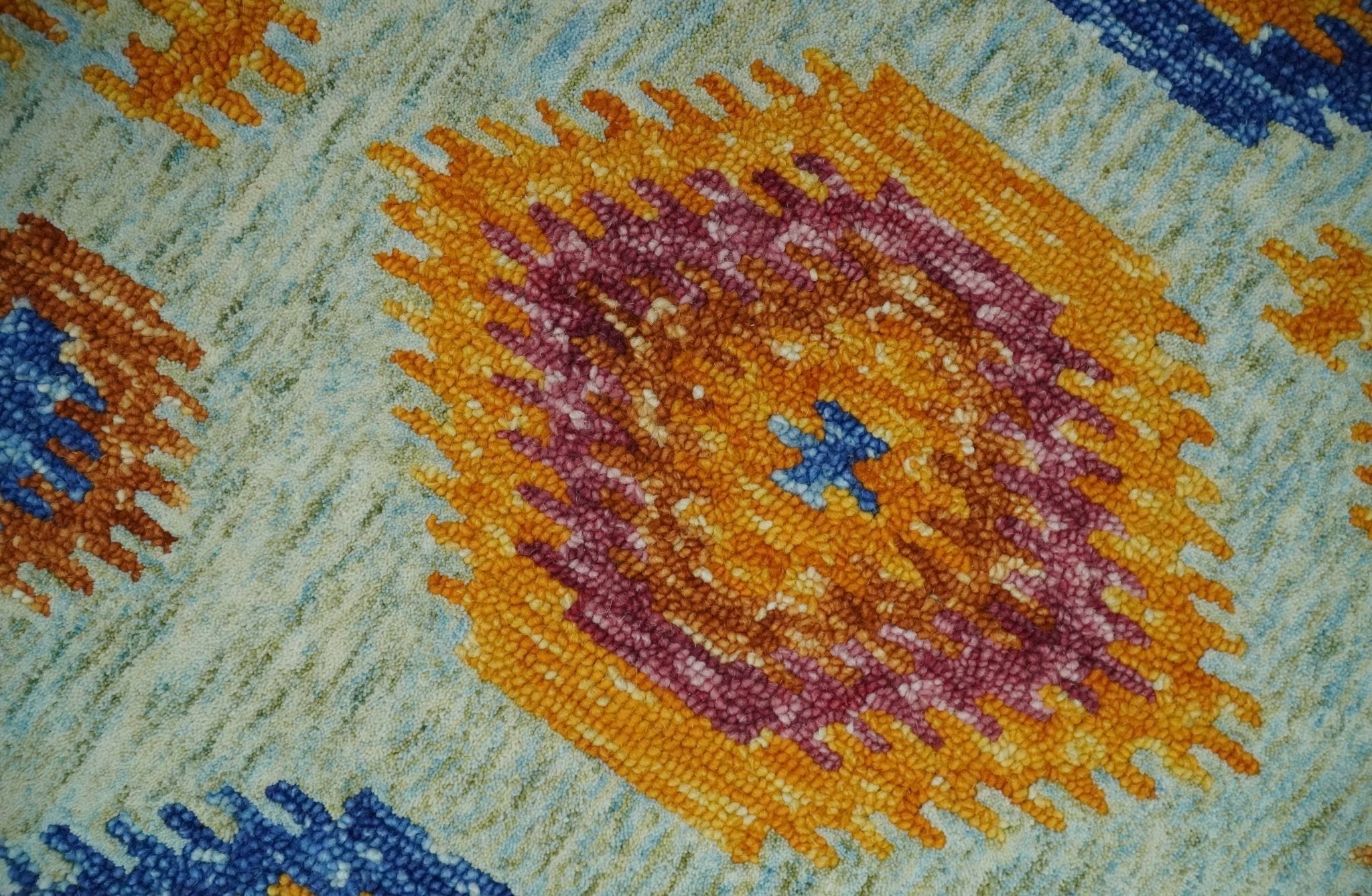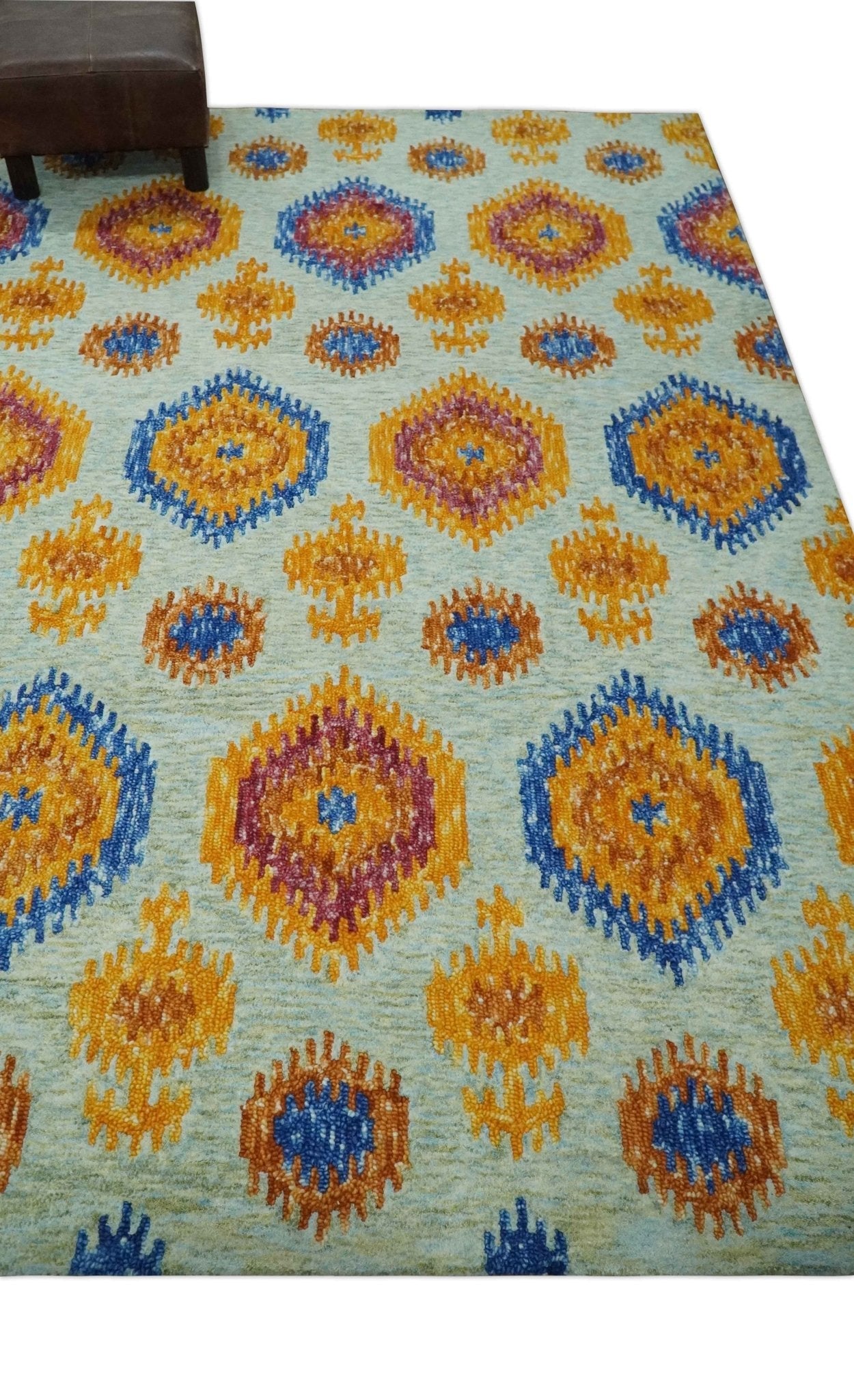 This 5x8 traditional ikat design rug is hand tufted from soft wool and features a classic three-tone ivory, gold, and blue color scheme. Enjoy a luxurious feel and contemporary sophistication in any room. Perfect for adding warm elegance to your home.