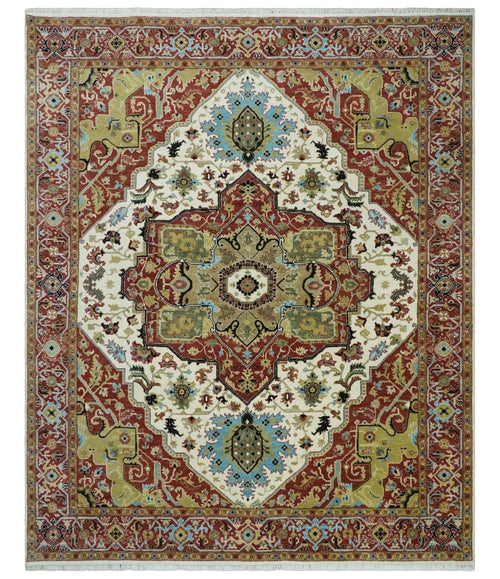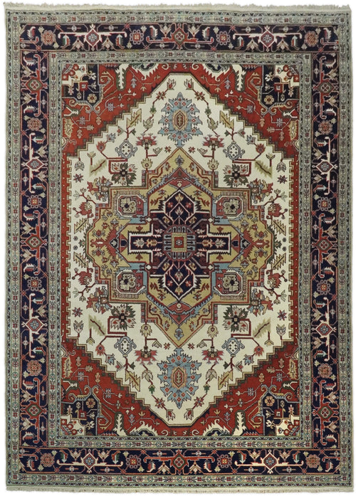 8x10 Hand Knotted Ivory Red and Blue Traditional Heriz Serapi Antique Wool Rug | TRDCP601810