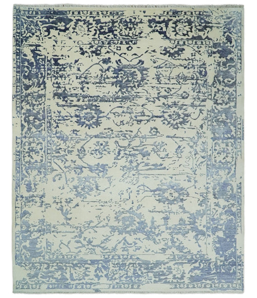 8x10 Fine Hand Knotted Ivory and Blue Modern Abstract Style Antique Wool and Silk Area Rug | TRDCP631810
