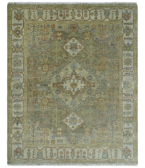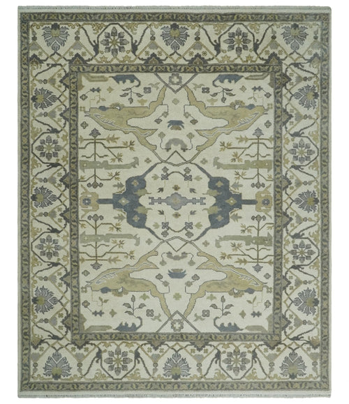8x10 Fine Hand Knotted Ivory, Gold and Olive Traditional Vintage Antique Oushak Persian Wool Rug | TRDCP902810