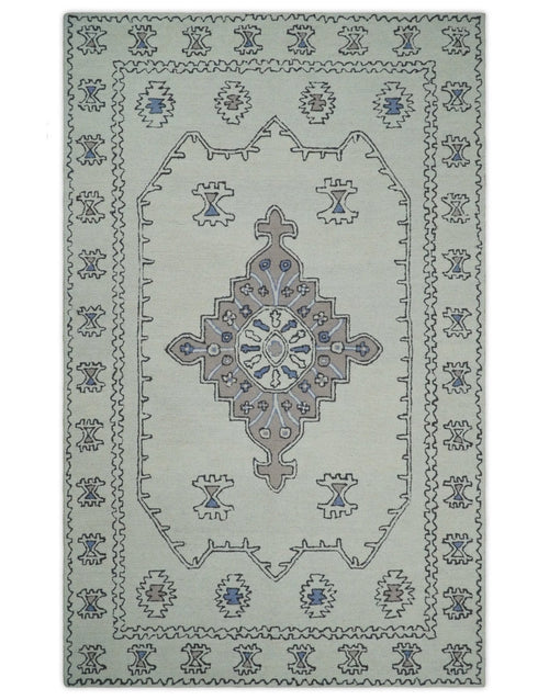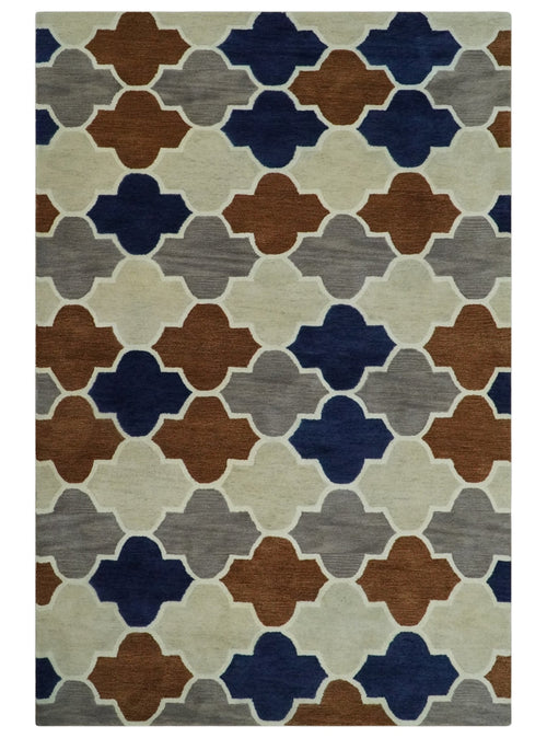 6x9 Ivory, Blue, Brown and Silver Ikat Pattern Hand Tufted Wool Area Rug