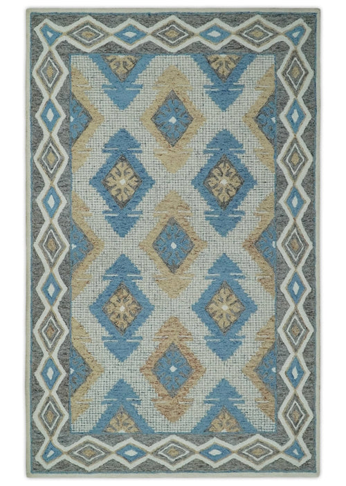 5x8 Ivory, Blue and Beige Traditional Ikat design Hand Tufted Wool Area Rug