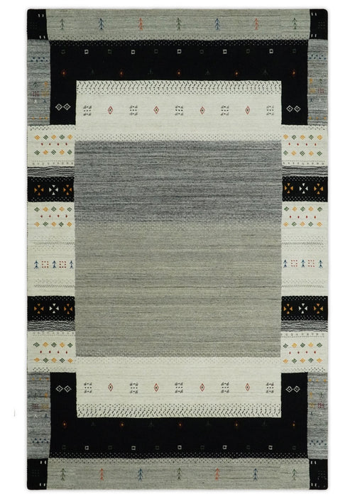 5x8 Ivory, Gray and Black Striped Wool Hand Woven Southwestern Gabbeh Rug | KNT18