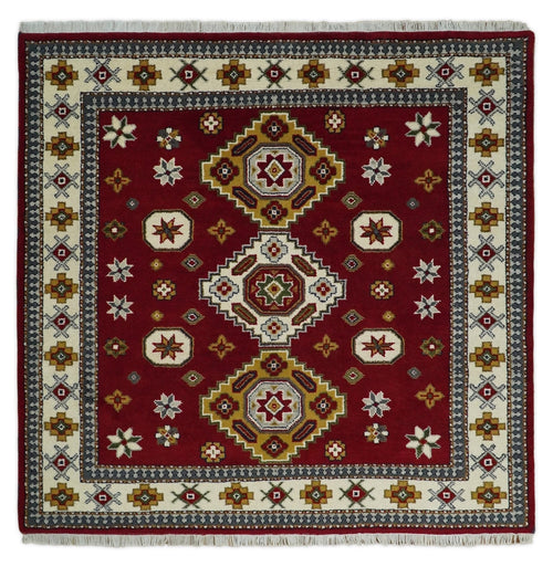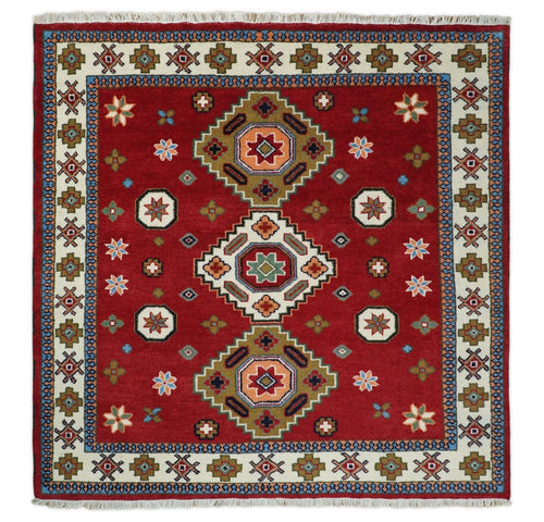 6x6 Square Hand Knotted Antique Kazak Red and Ivory Traditional Tribal Armenian Rug | KZA15