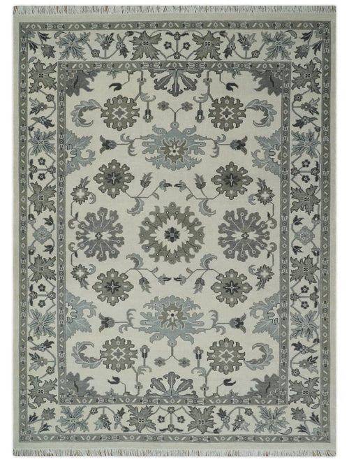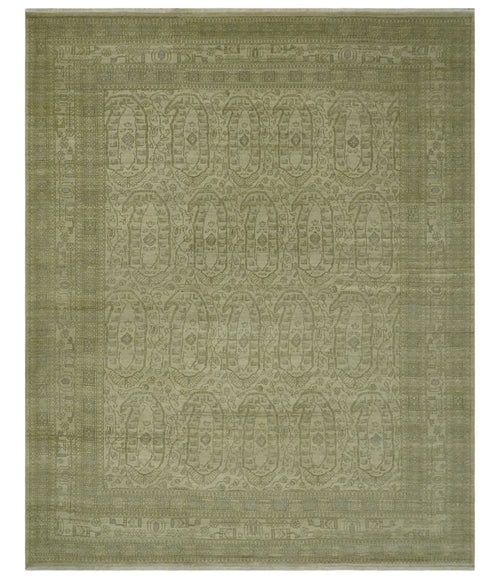8.6x10 Hand Knotted Ivory and Green Floral Traditional Antique Style Wool Area Rug