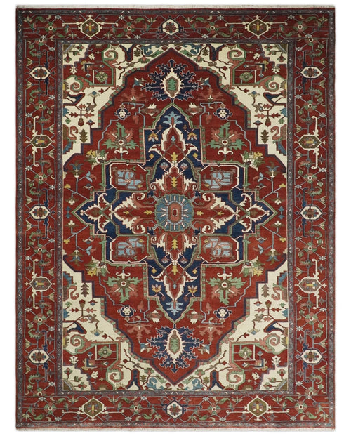 8x10 and 10x14 Fine Hand Knotted Rust, Ivory and Blue Traditional Vintage Heriz Serapi Antique Wool Rug