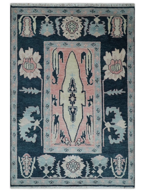 5x8 Dark Blue, Ivory and Peach Hand Knotted Heriz Serapi Medallion Area Rug | TRDPC41