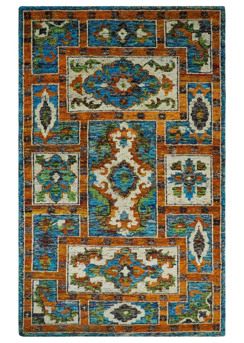 5x8 Hand Knotted Ivory, Teal Blue and Brown Antique Persian Style Contemporary Bamboo Silk Area Rug | OP76