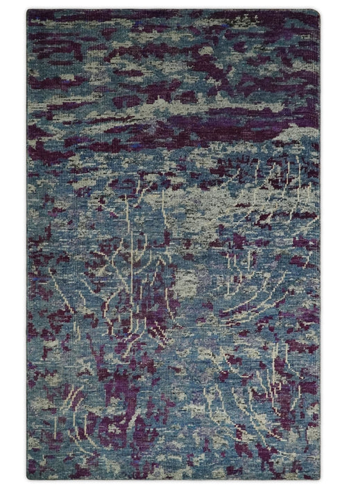 5x8 Hand Knotted Ivory, Blue and Purple Modern Abstract Contemporary Recycled Silk Area Rug | OP72