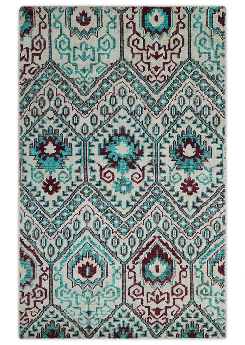 5x8 Hand Knotted Dark Teal and Ivory Modern Contemporary Southwestern Tribal Trellis Recycled Silk Area Rug | OP115