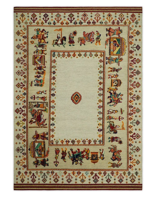 5x7 Flatwoven Soumak, Ivory and Beige Indian Wedding, Hand Spun Wool Hand Knotted Southwestern Gabbeh Rug | KNT42